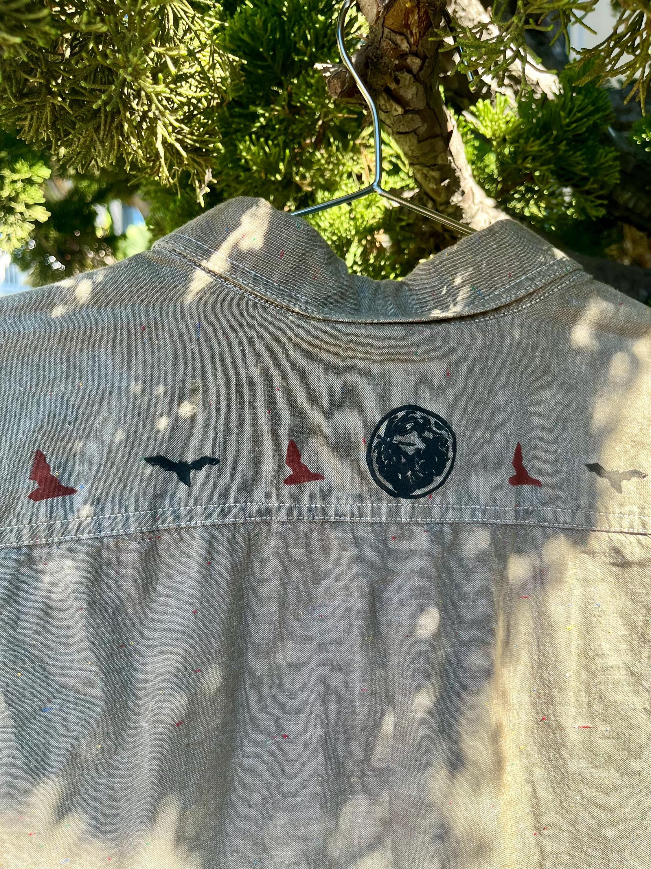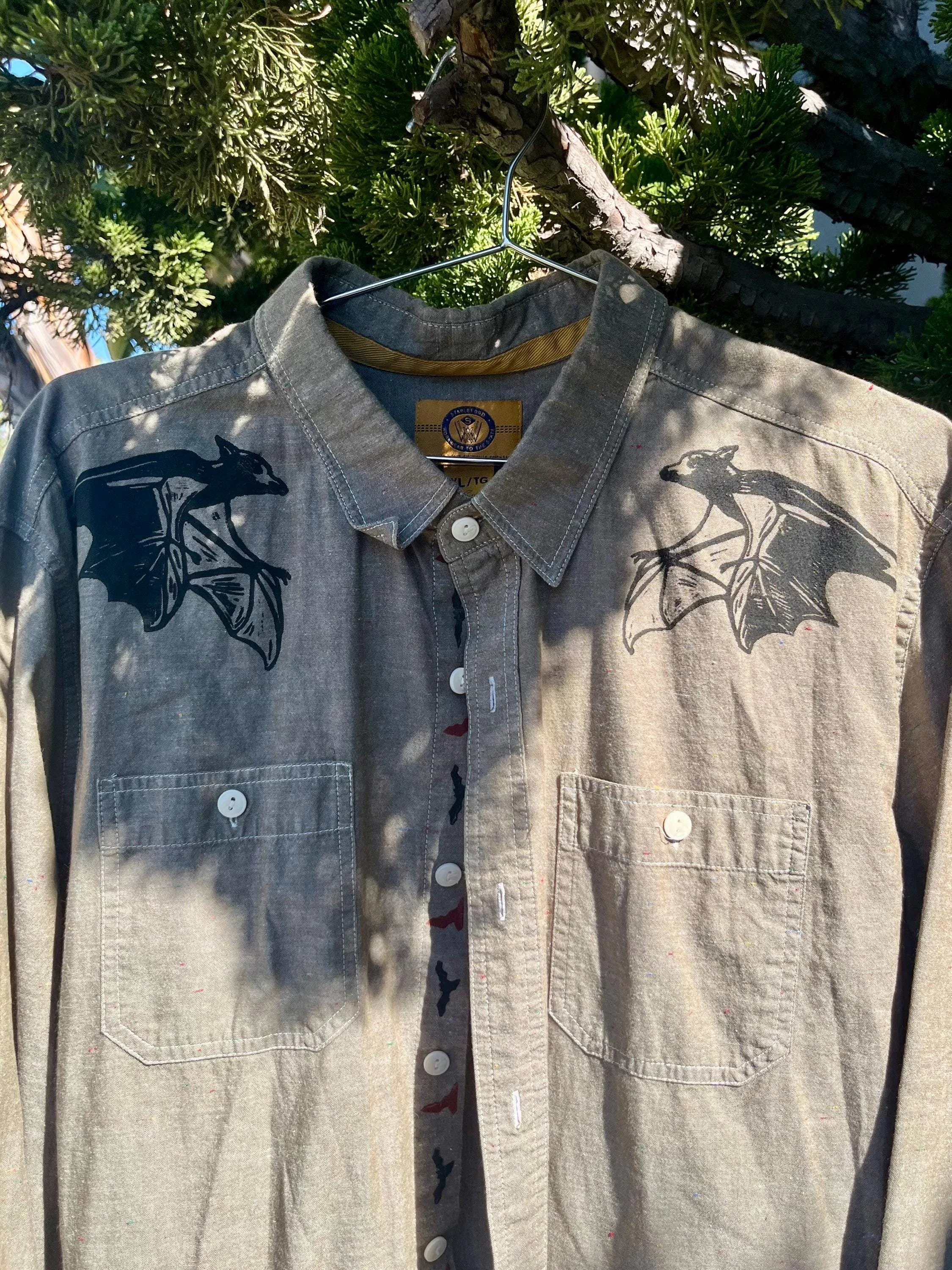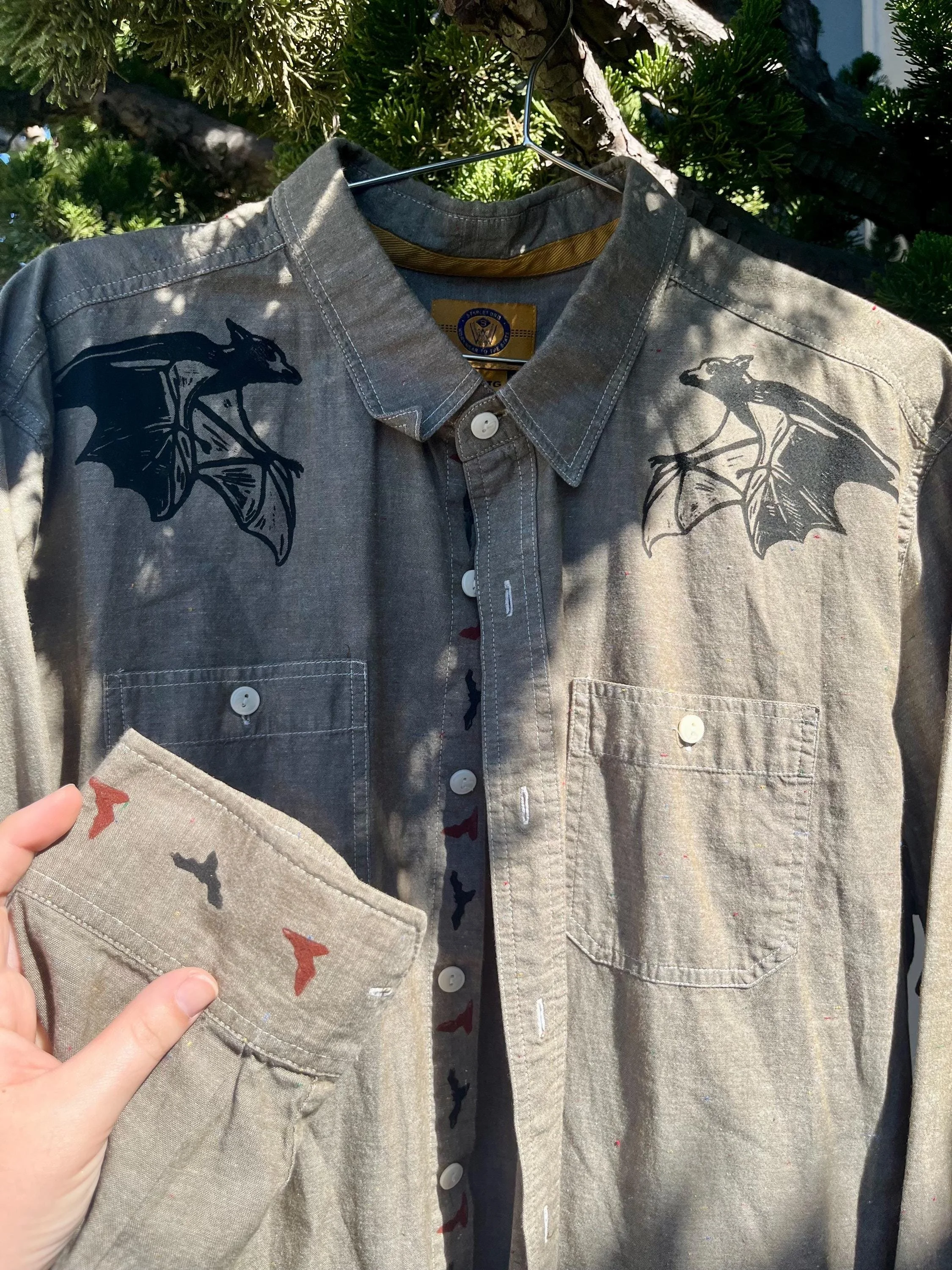 This shirt features my signature bat design, in red and black. Peekaboo bat design can be seen behind button holes when worn open as well!