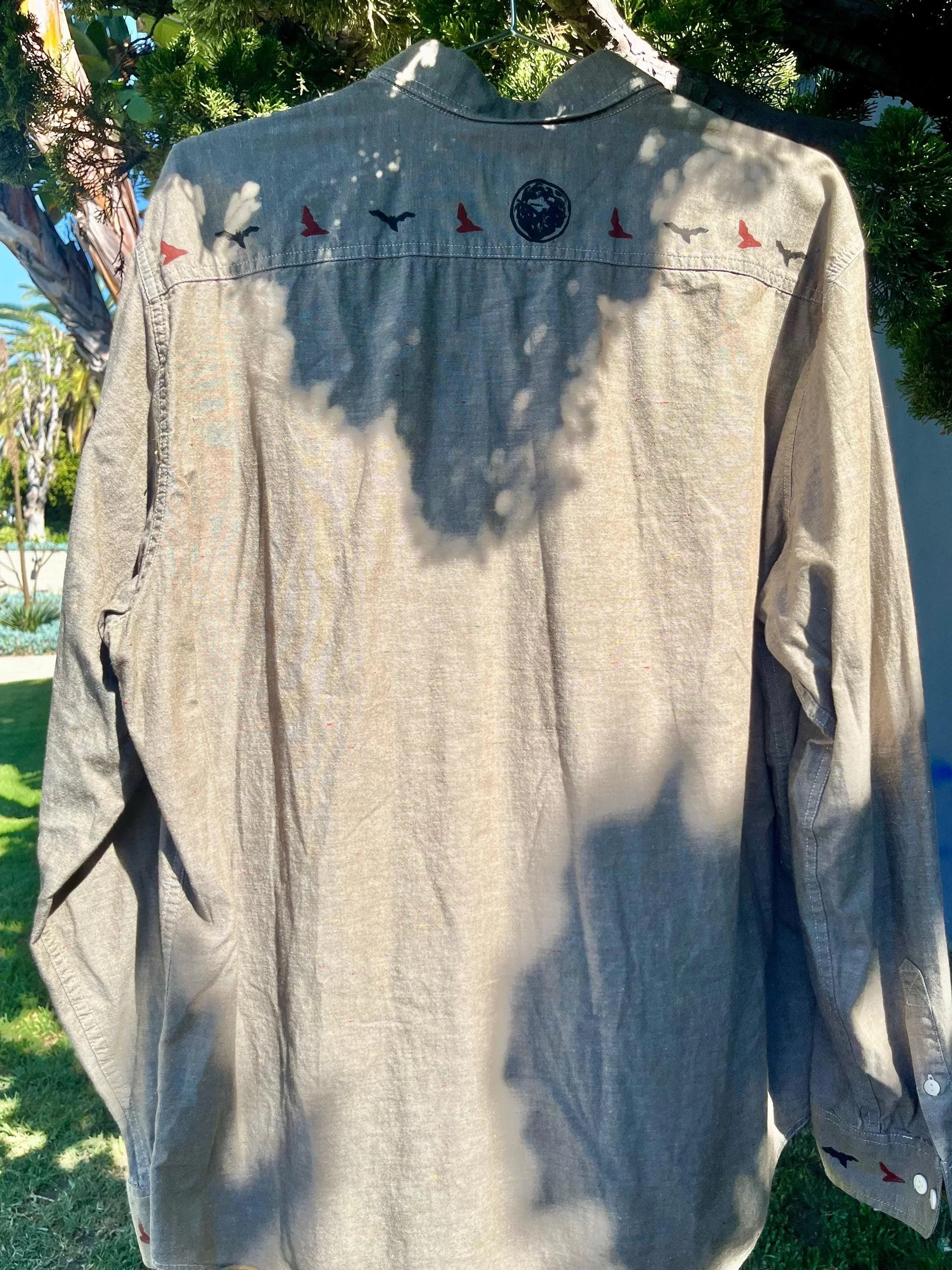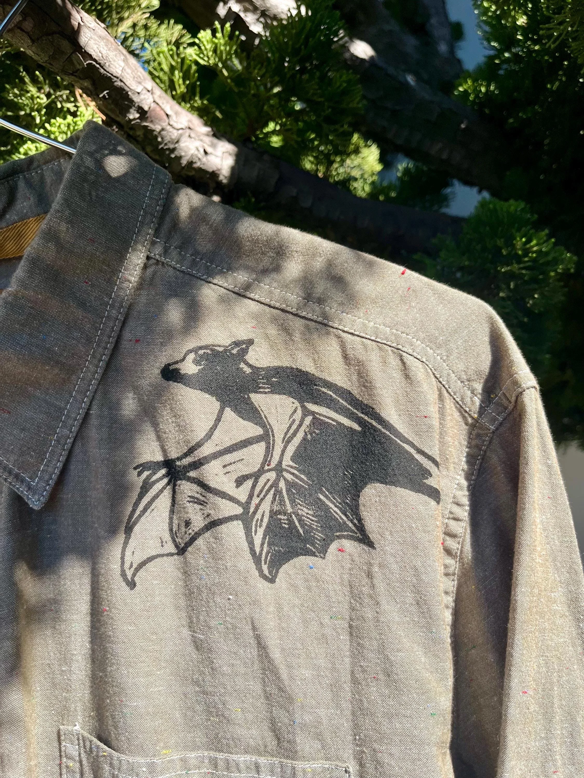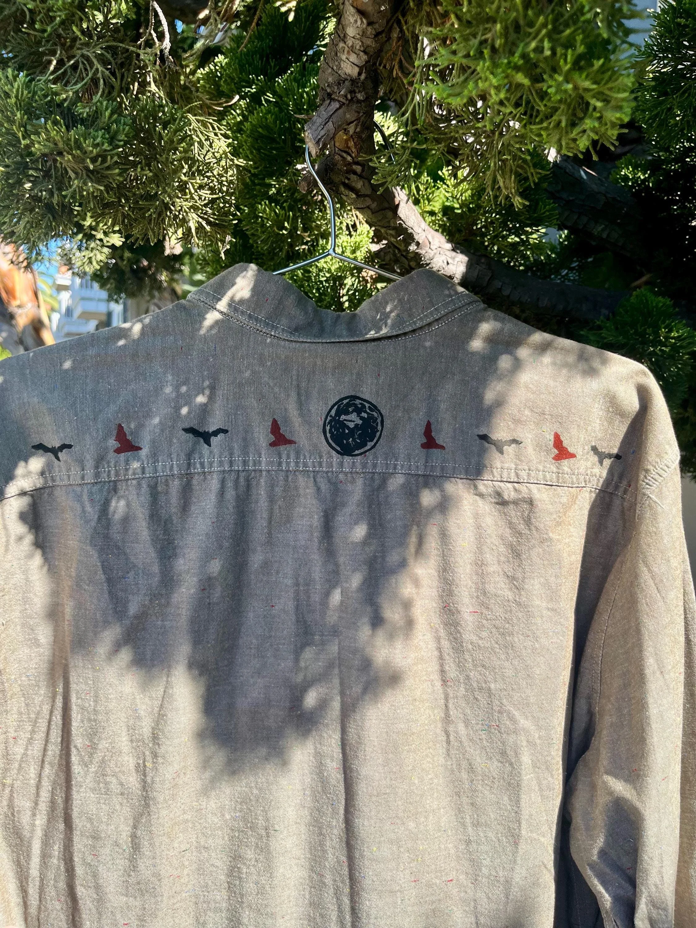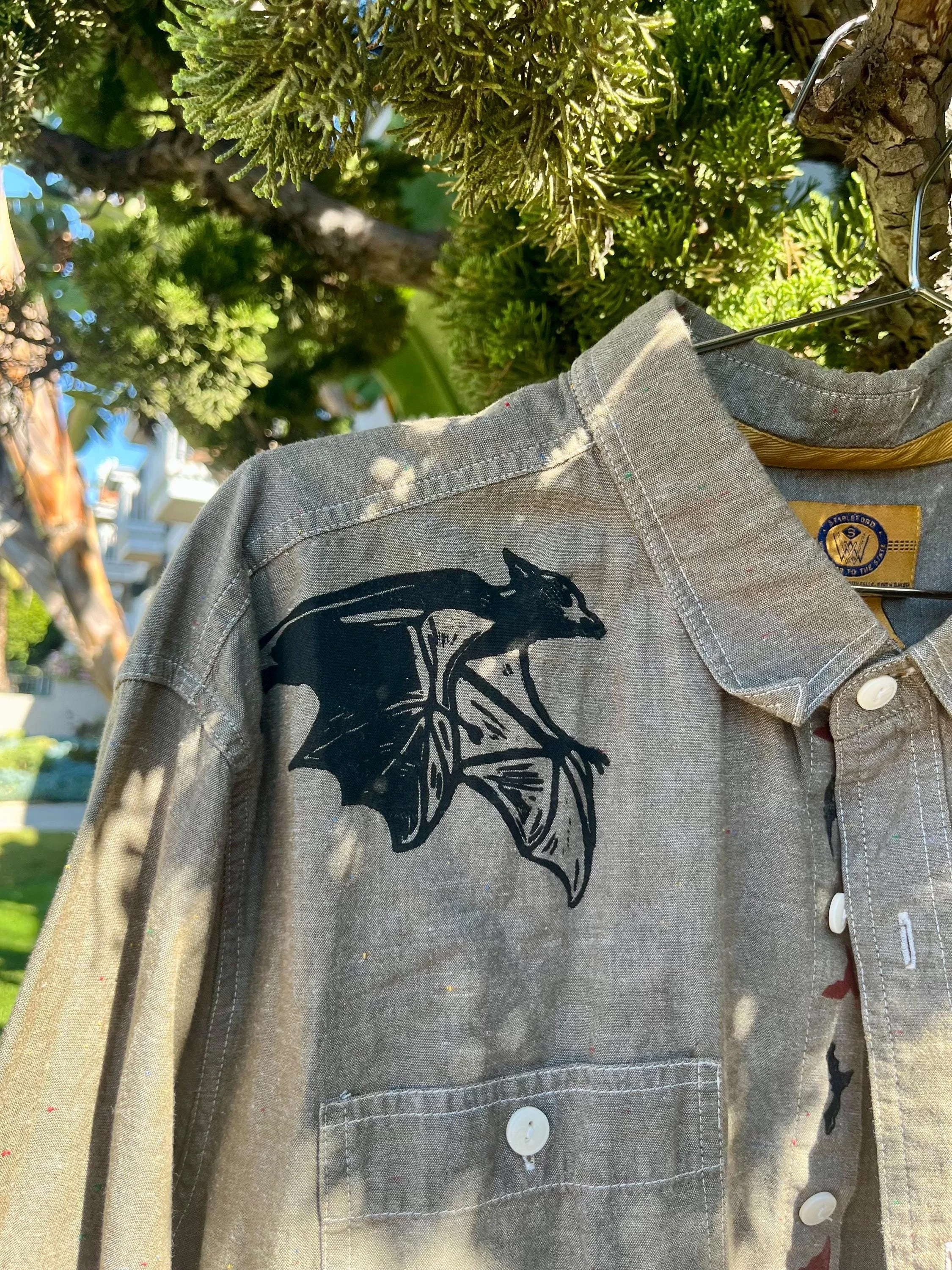This shirt features my signature bat design, in red and black. Peekaboo bat design can be seen behind button holes when worn open as well!