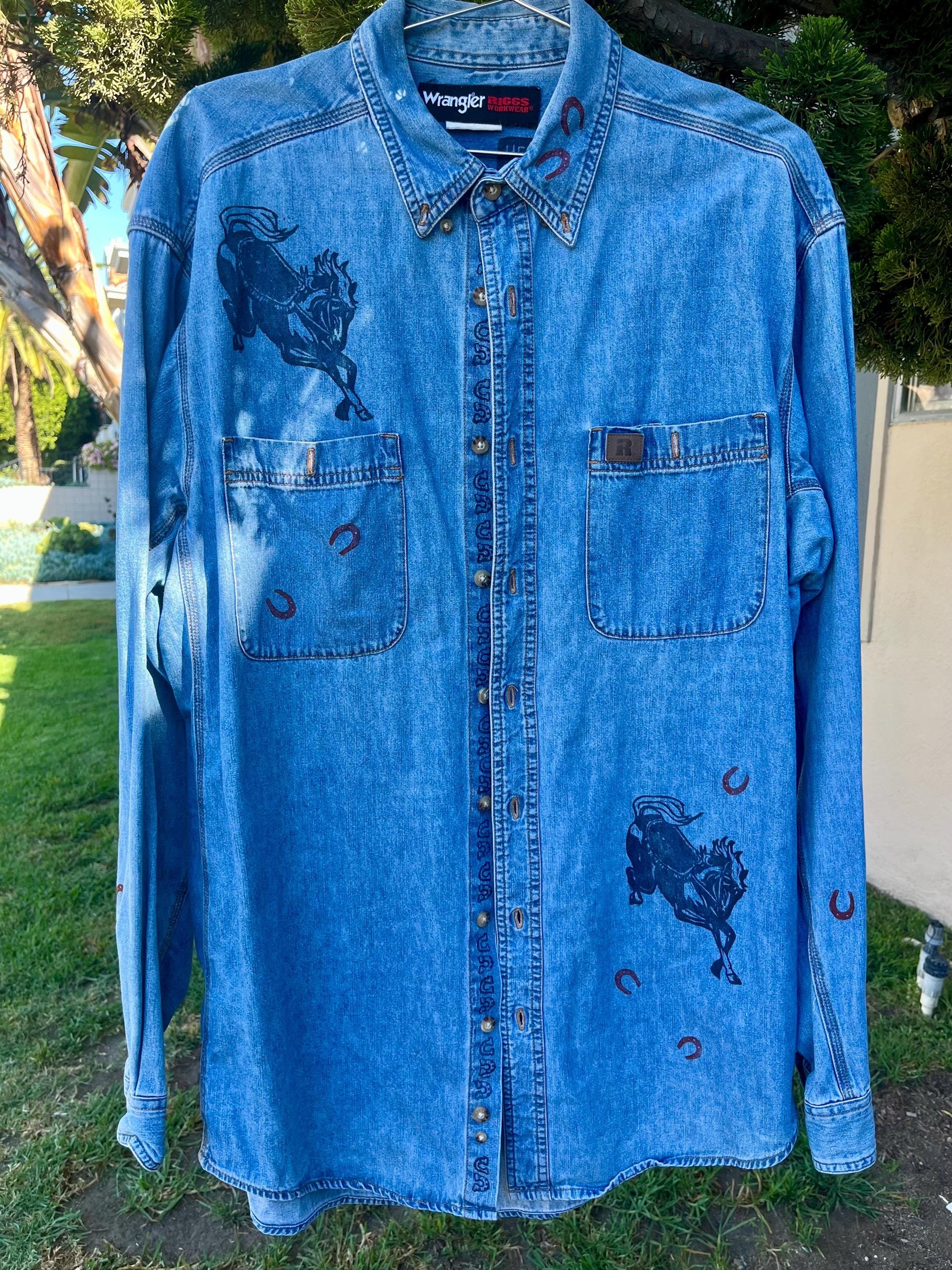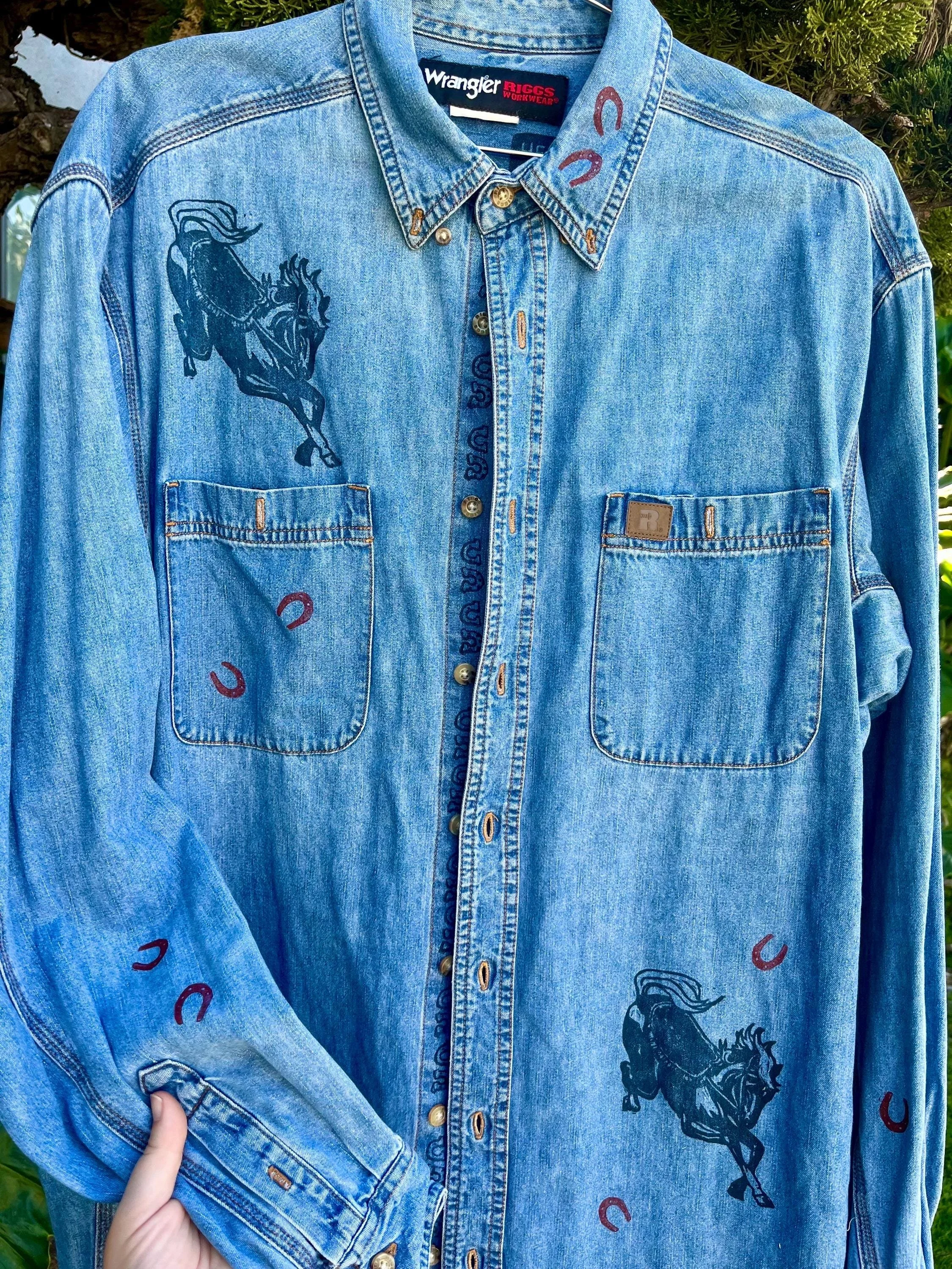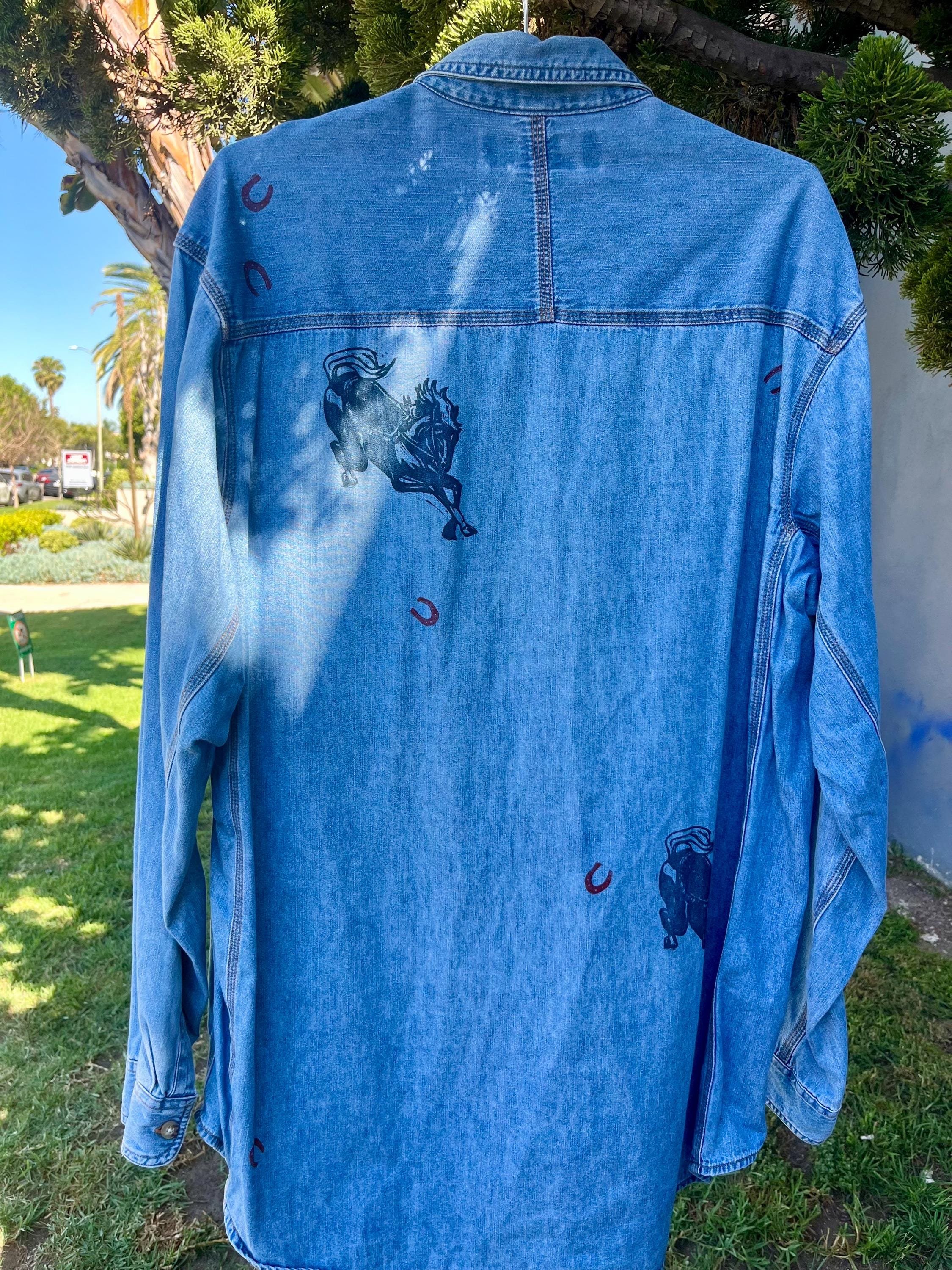 Hand Block Printed Denim Cotton Button Down: Horses, Size XL