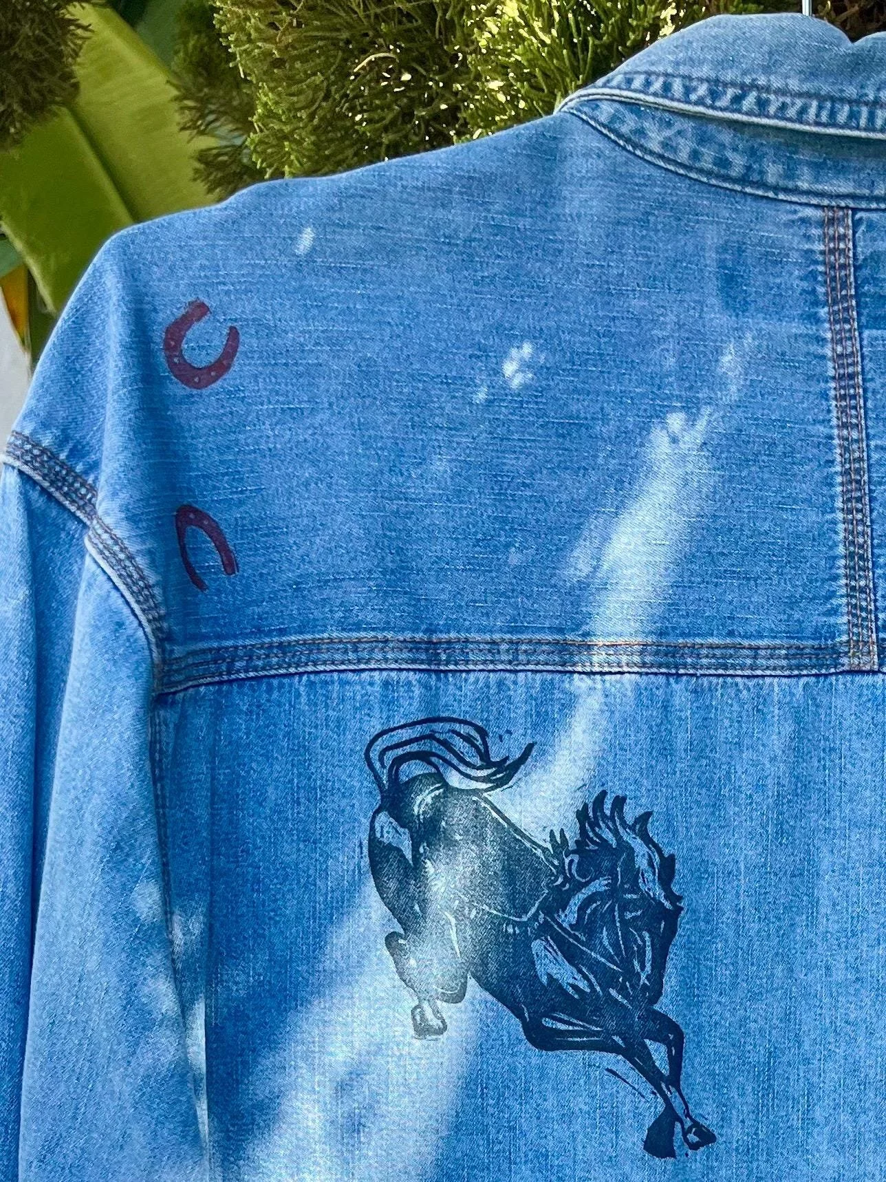 A rare (ish) duel-color block print design with horses and horseshoes in blue and red. Peekaboo horseshoes also featured on the inside of the buttons that can be seen only when worn open.