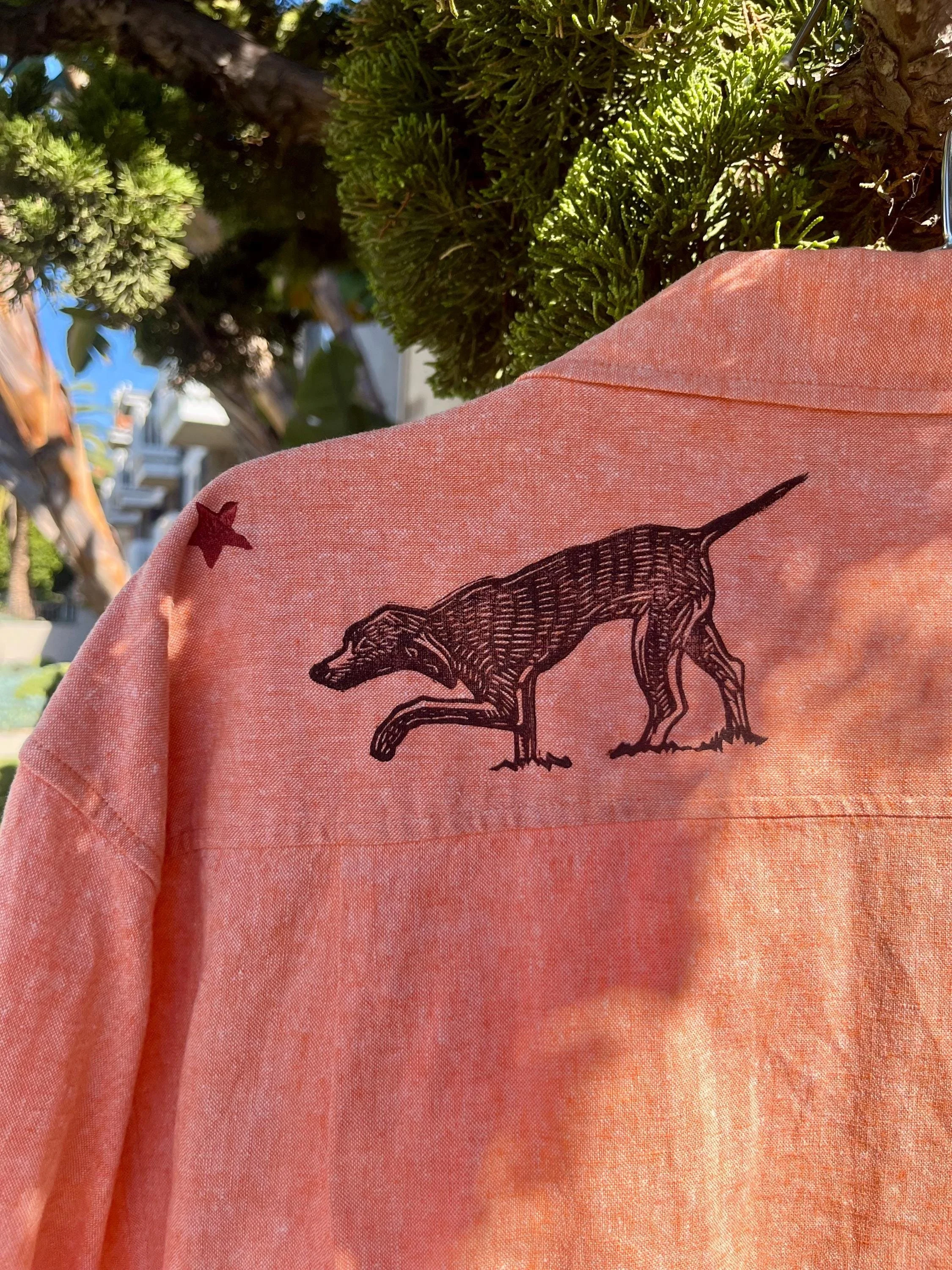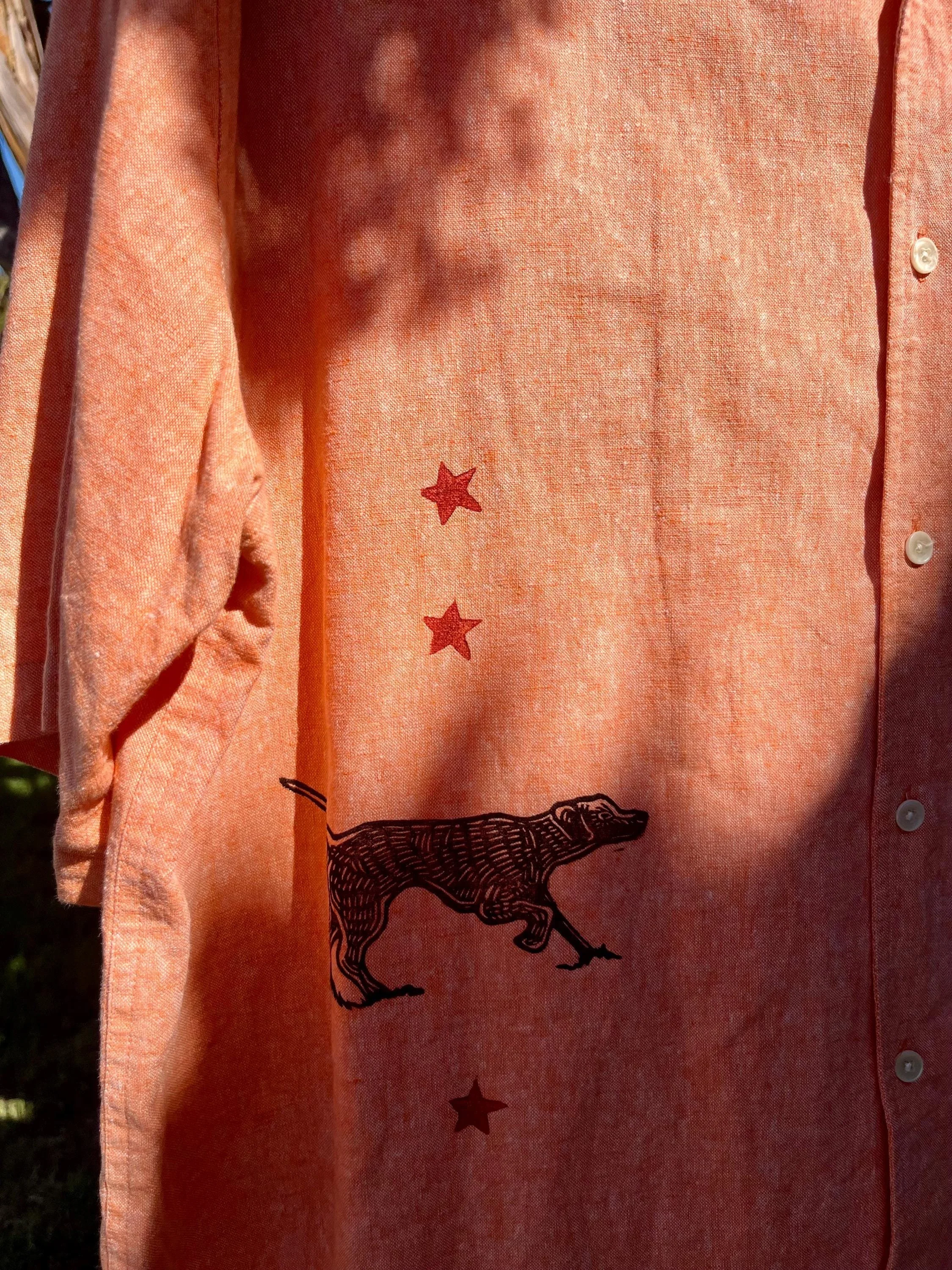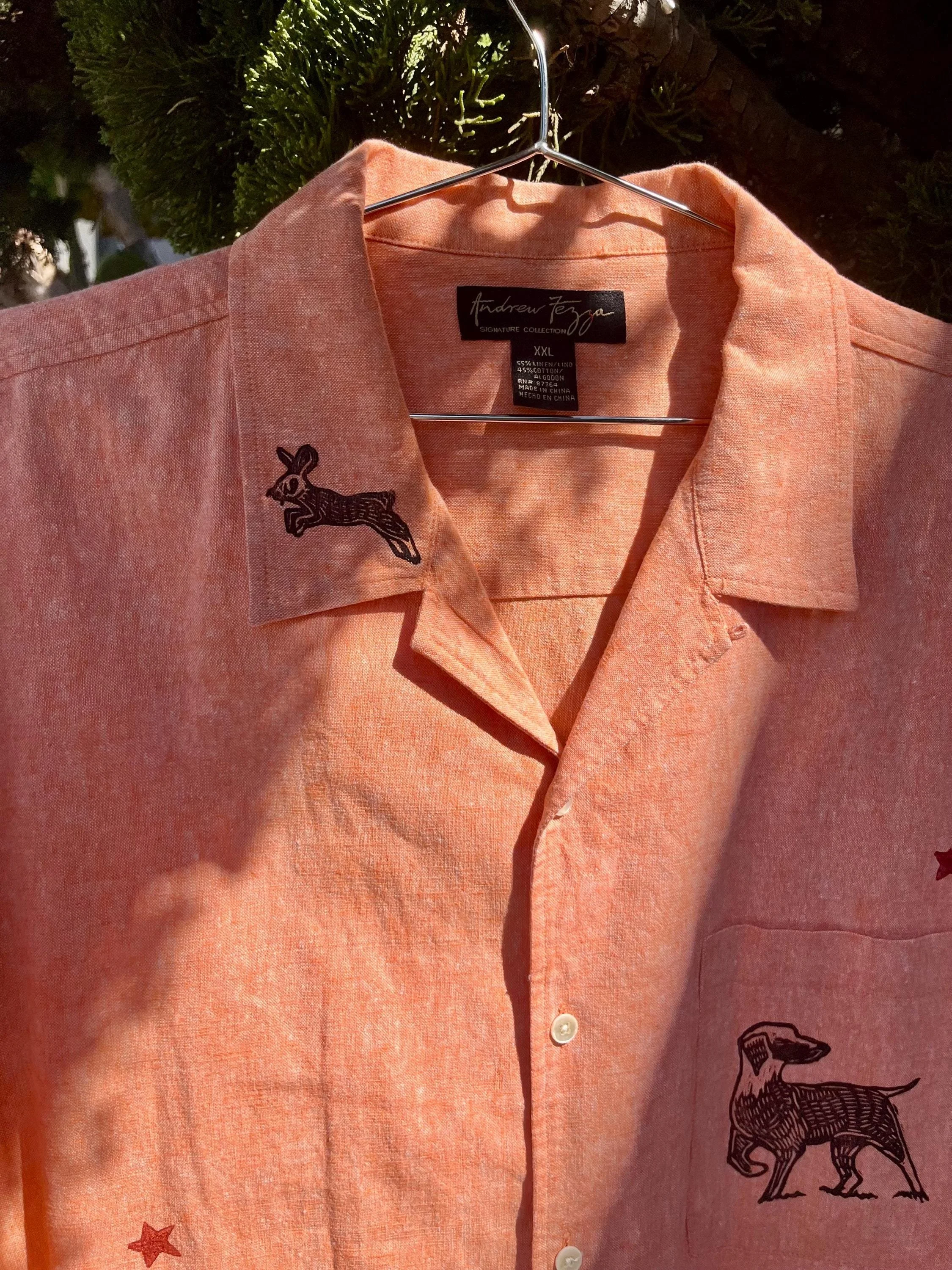 This peachy orange shirt features my latest carving of dogs and rabbits in a chase! With dueling black and red color prints.