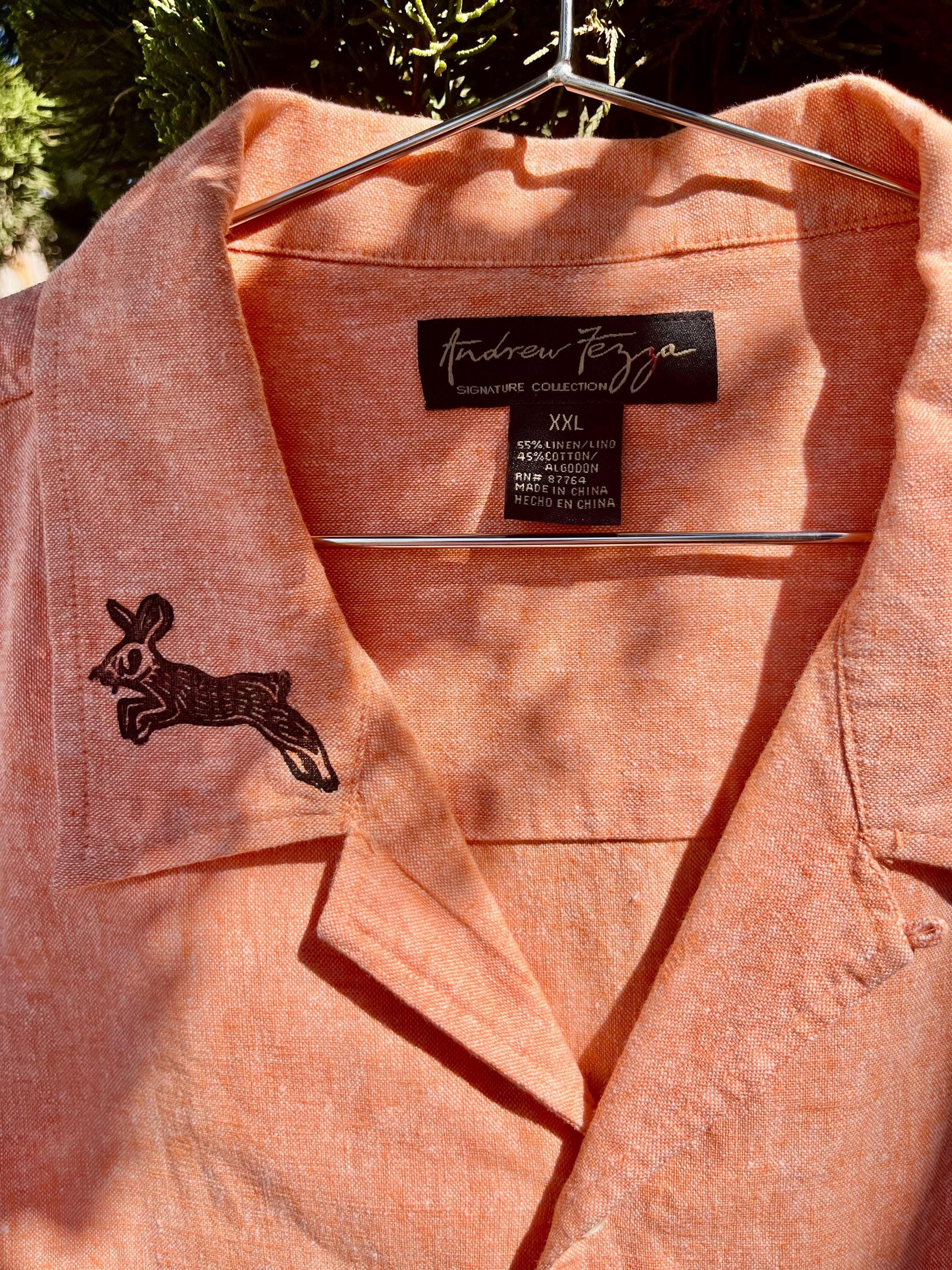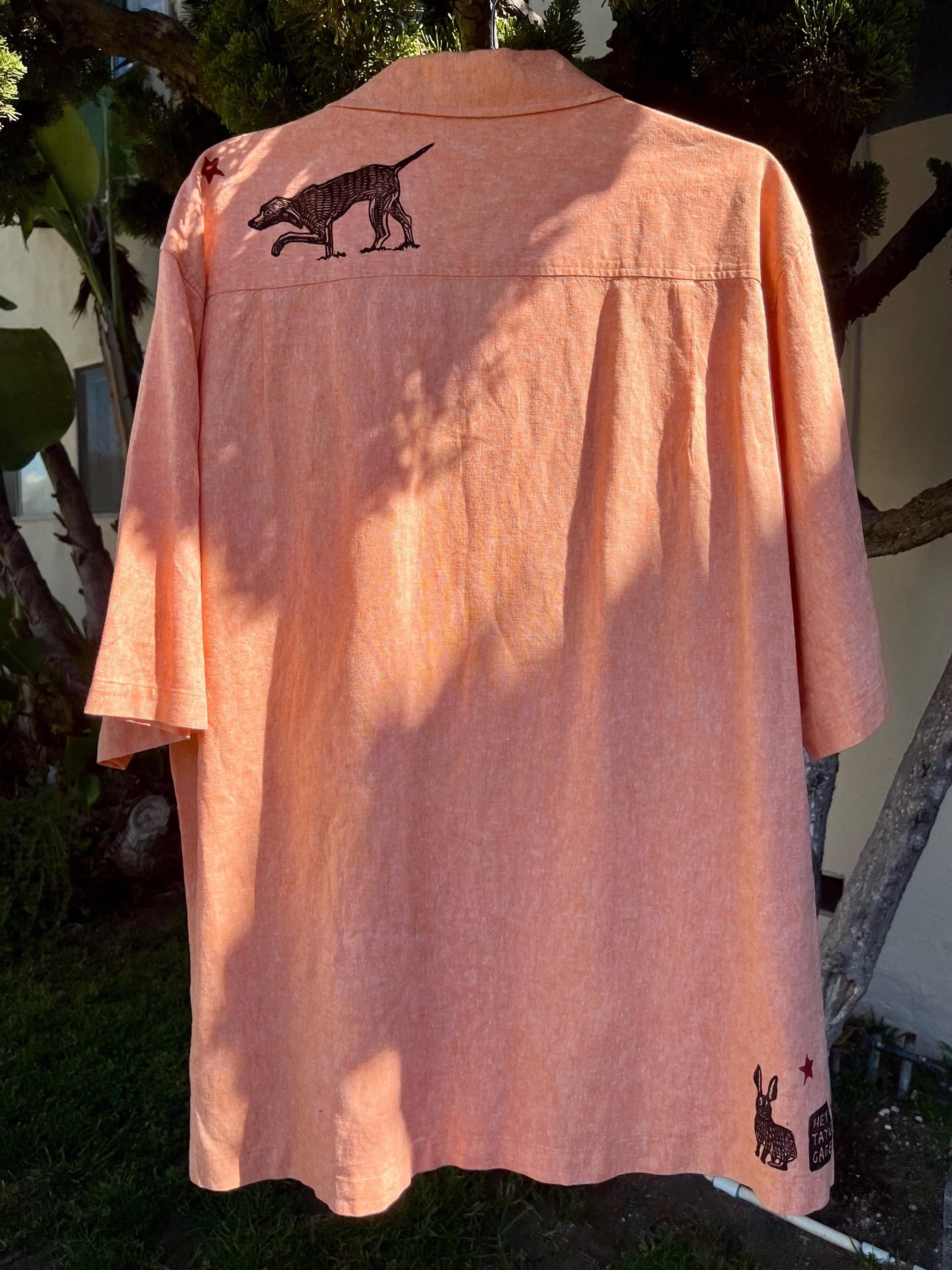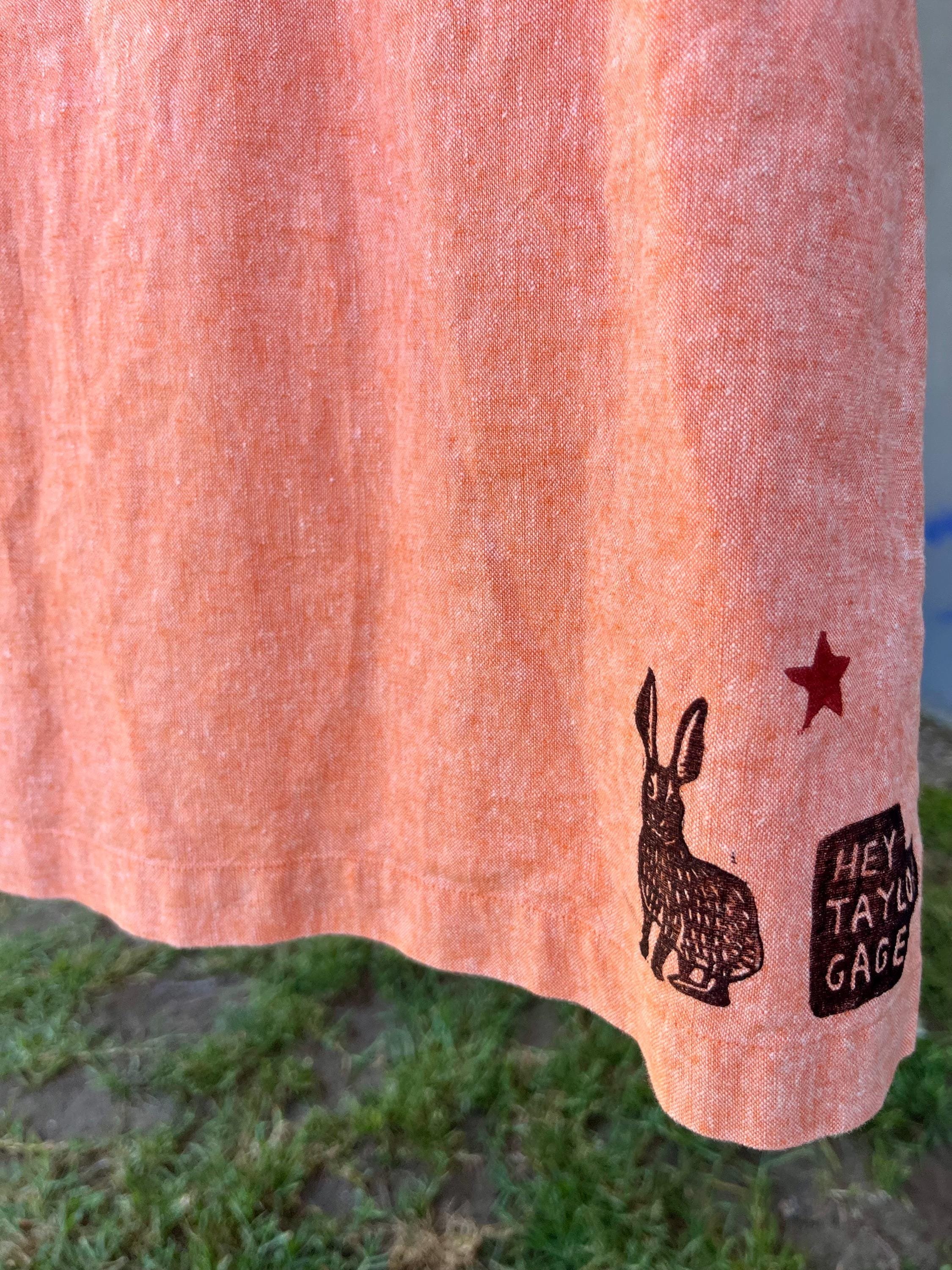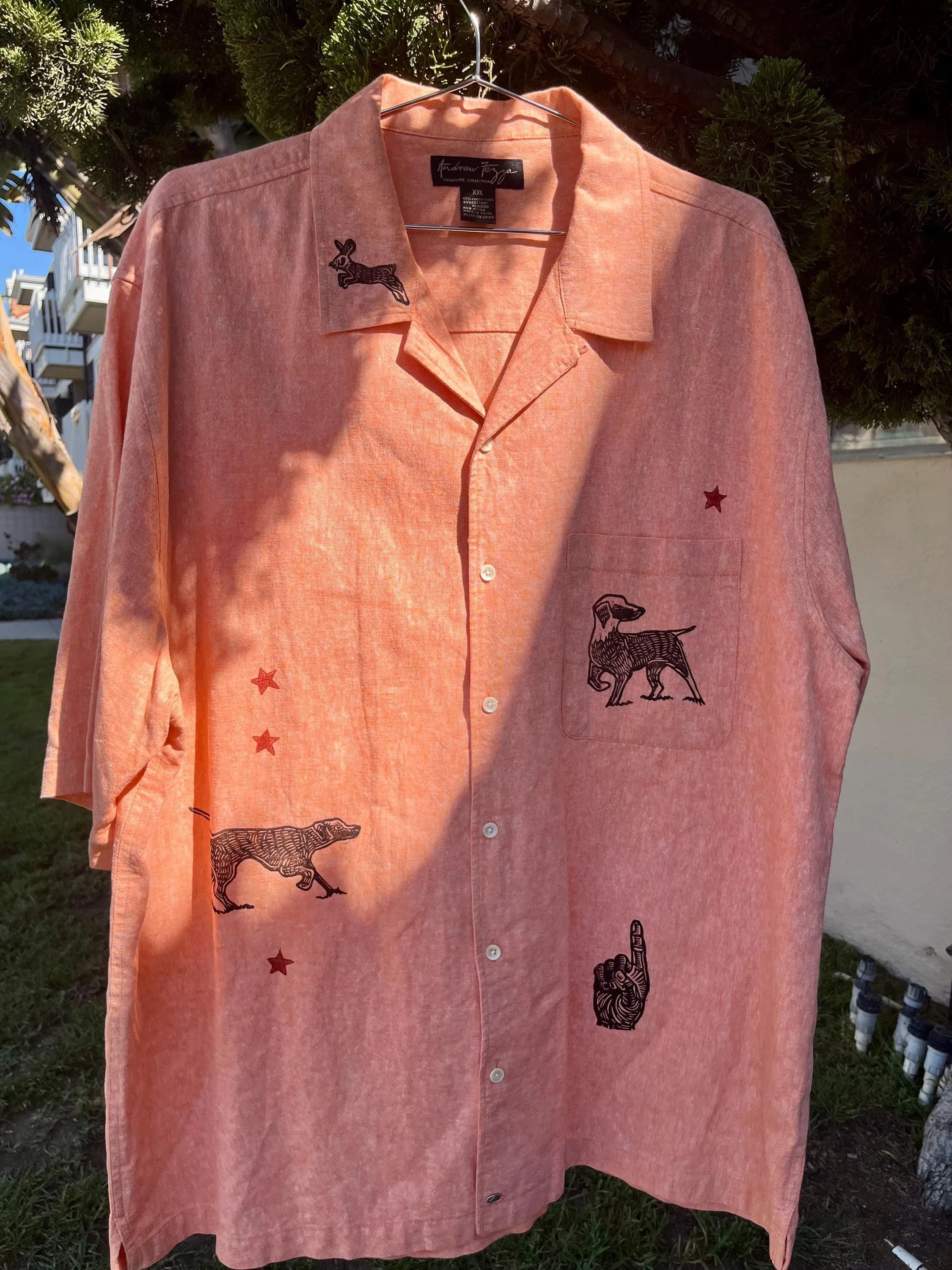 This peachy orange shirt features my latest carving of dogs and rabbits in a chase! With dueling black and red color prints.