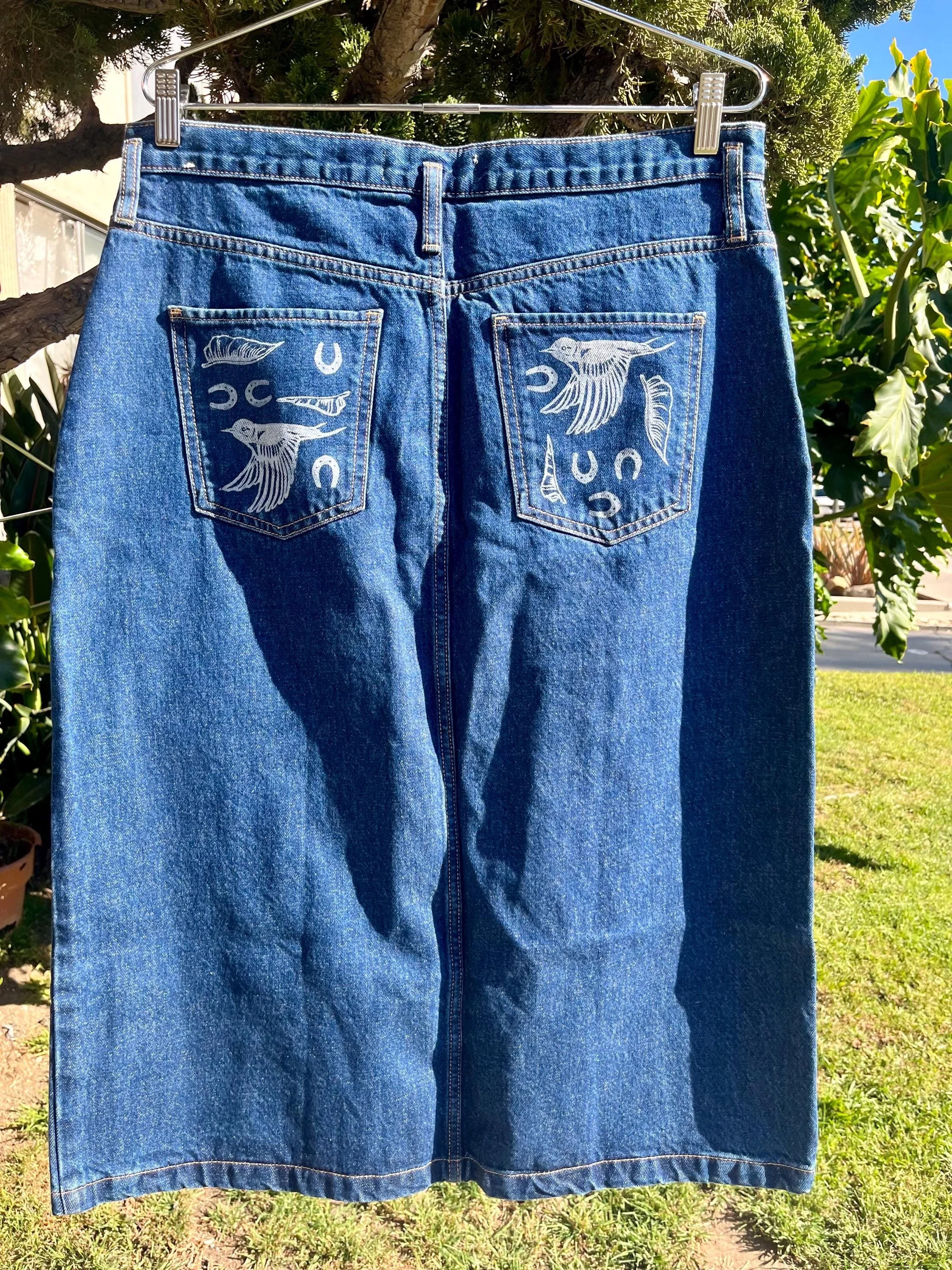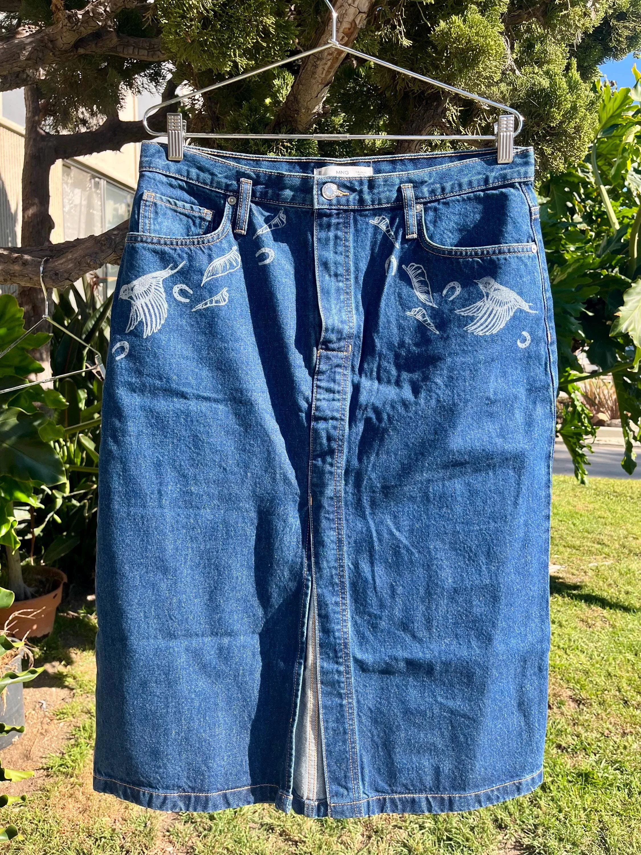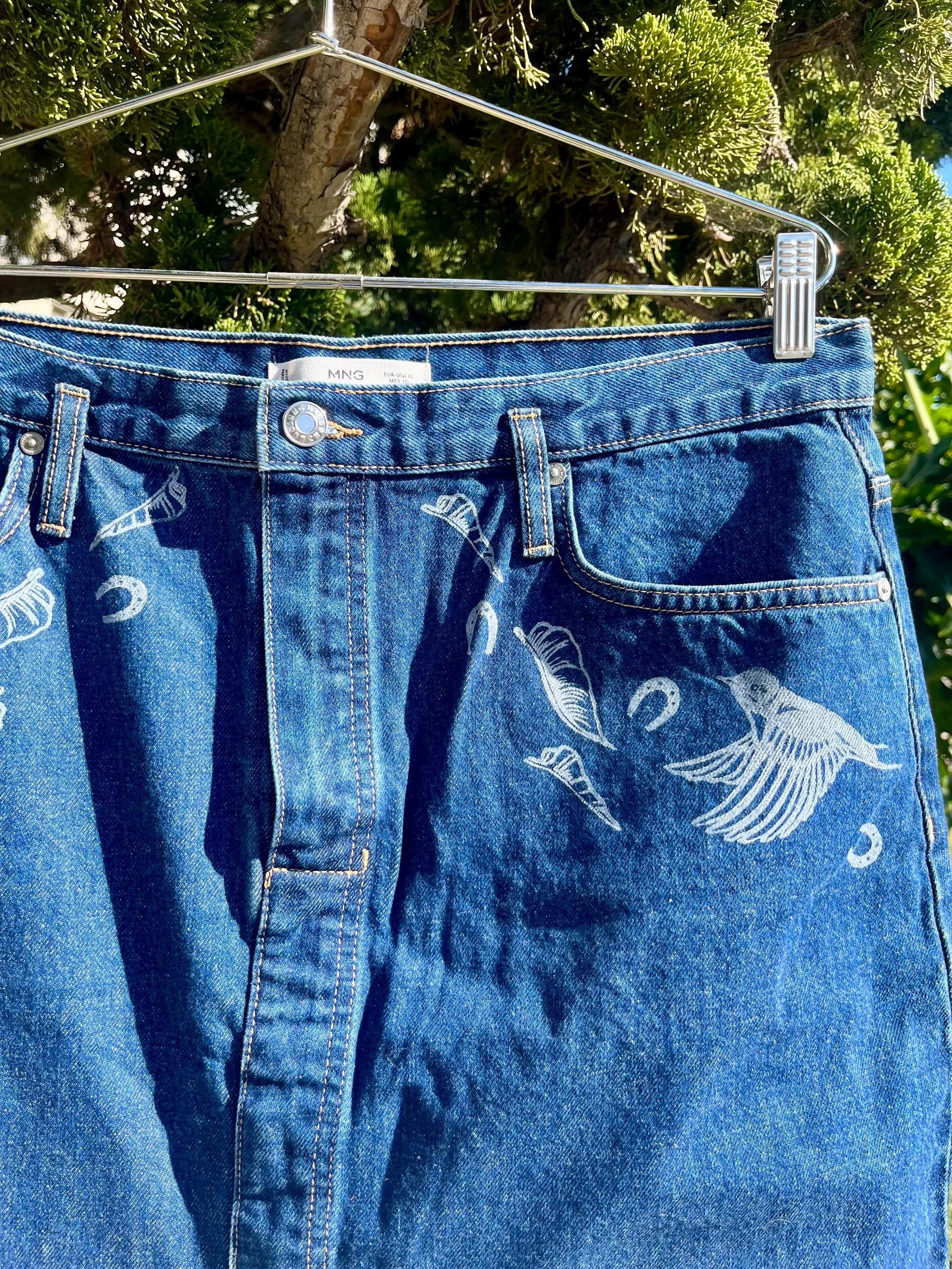 Hand Printed Midi Denim MNG Skirt Reworked with Bird design