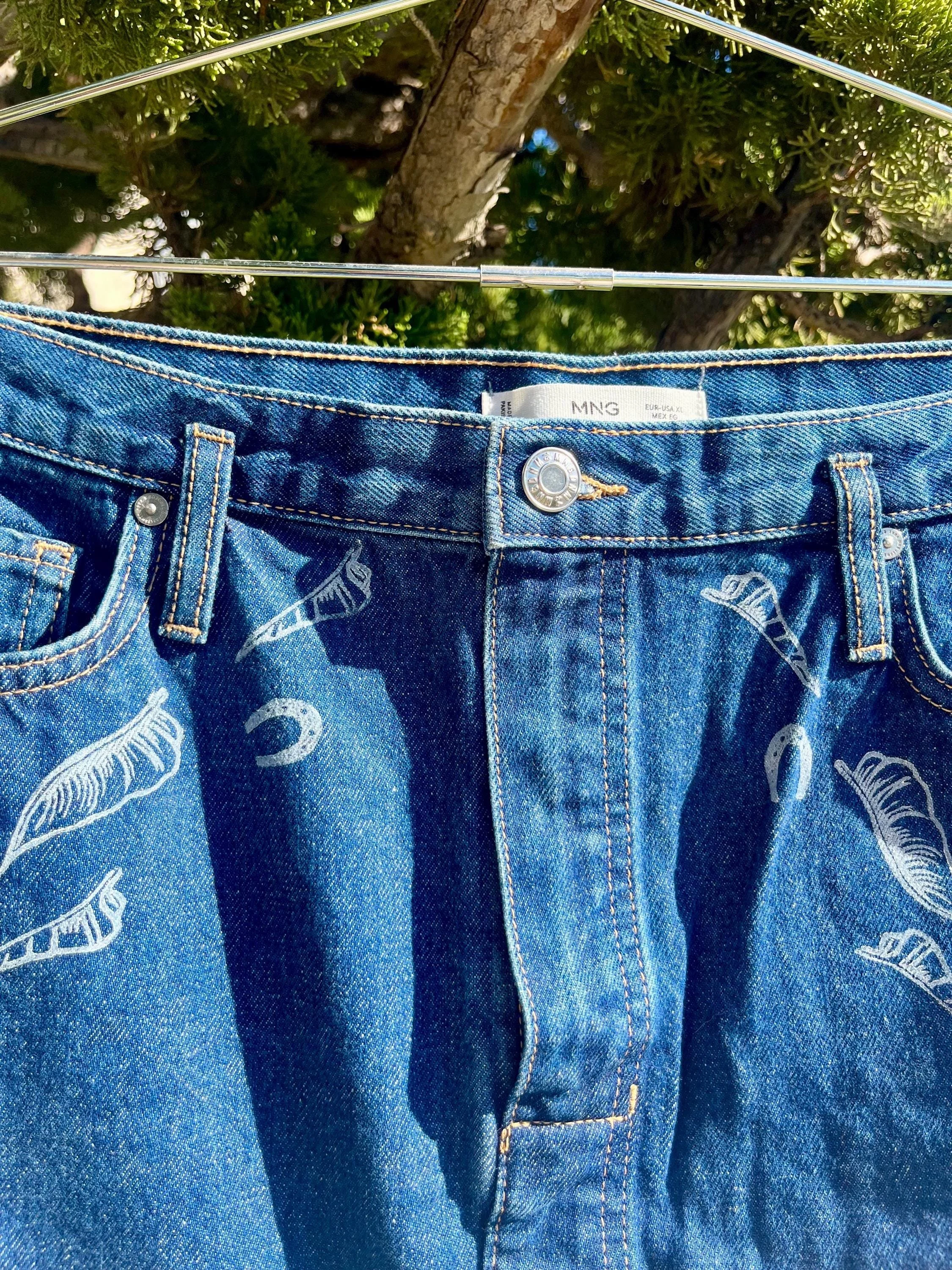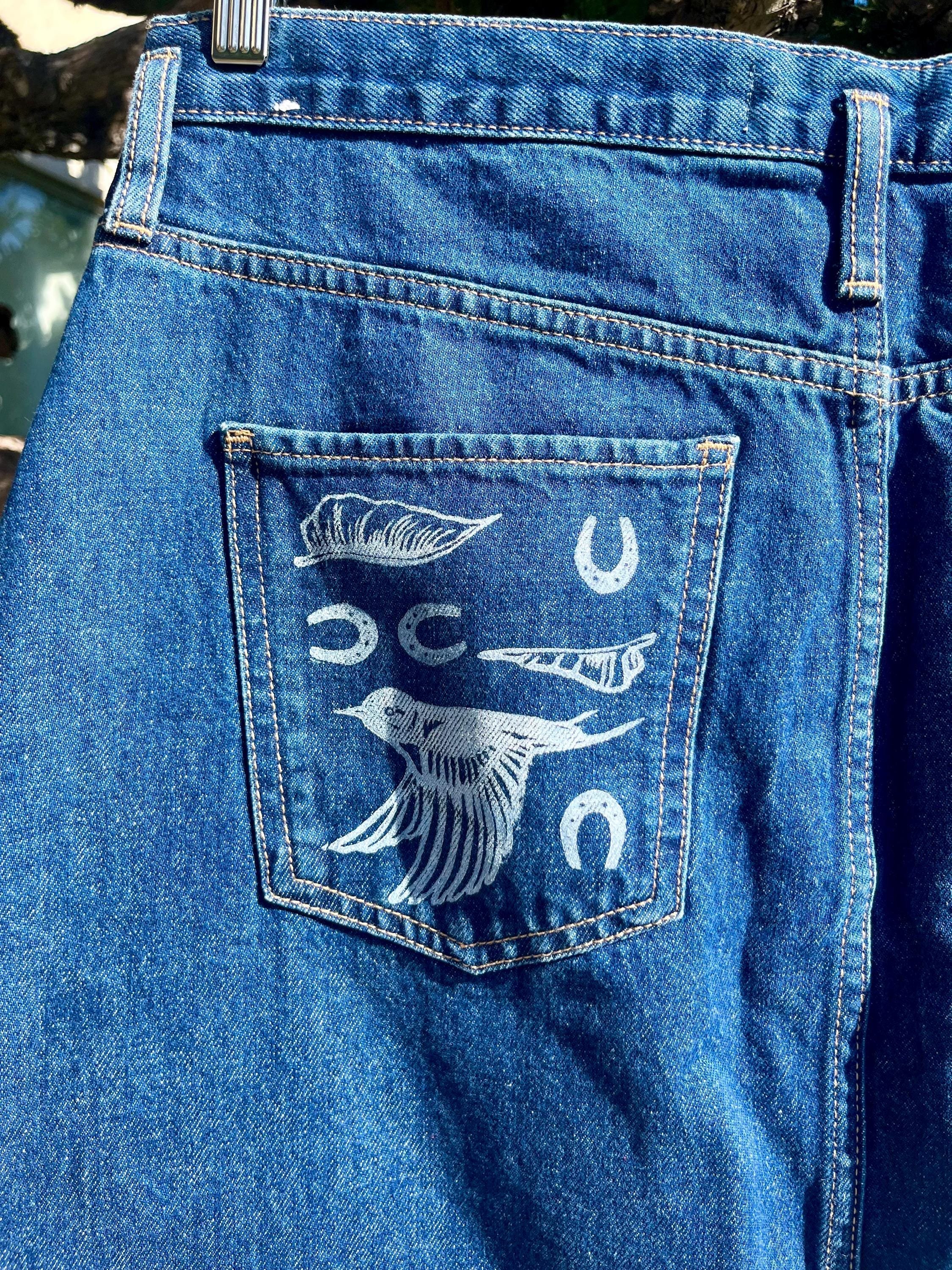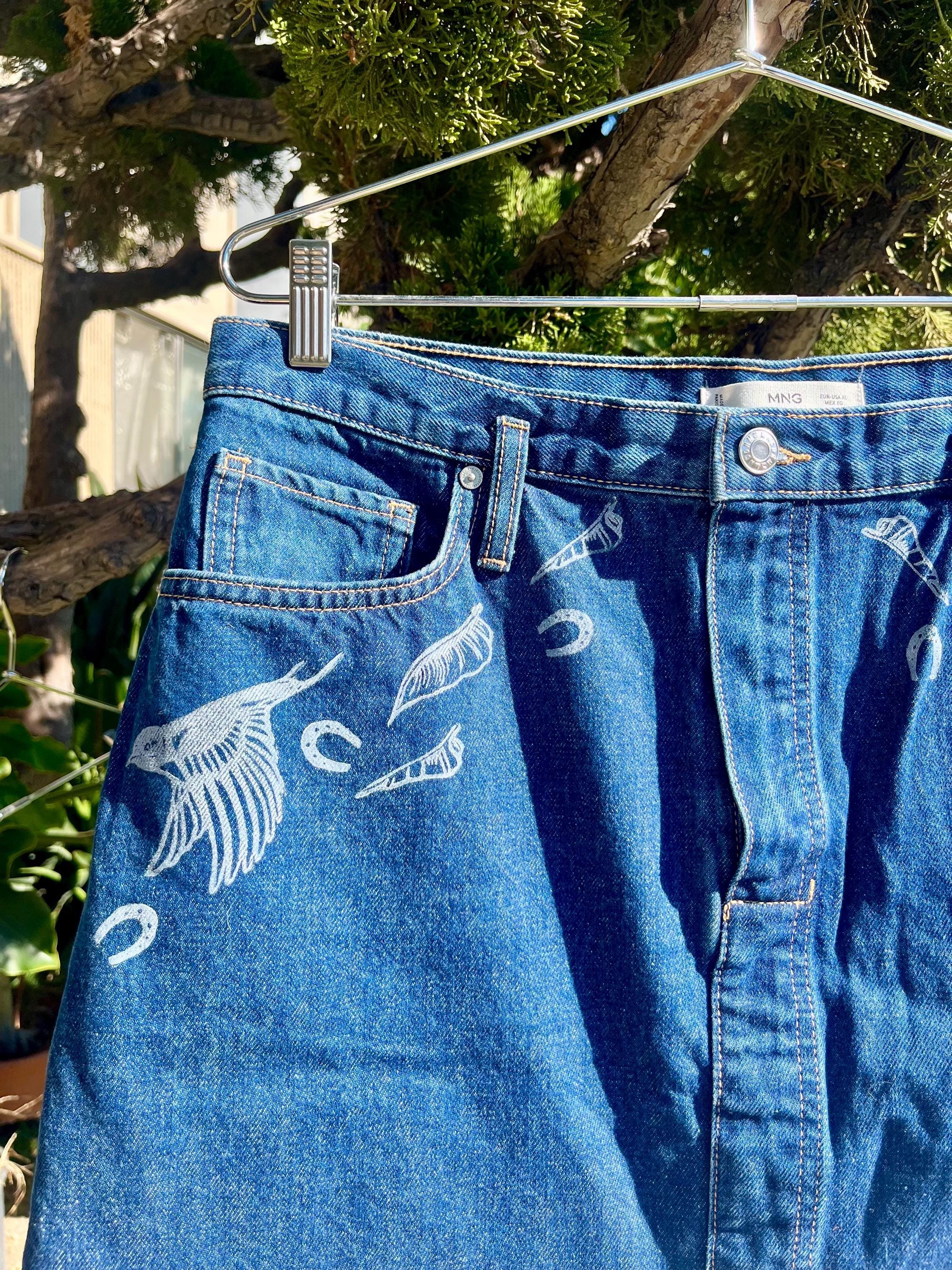 Hand Printed Midi Denim MNG Skirt Reworked with Bird design