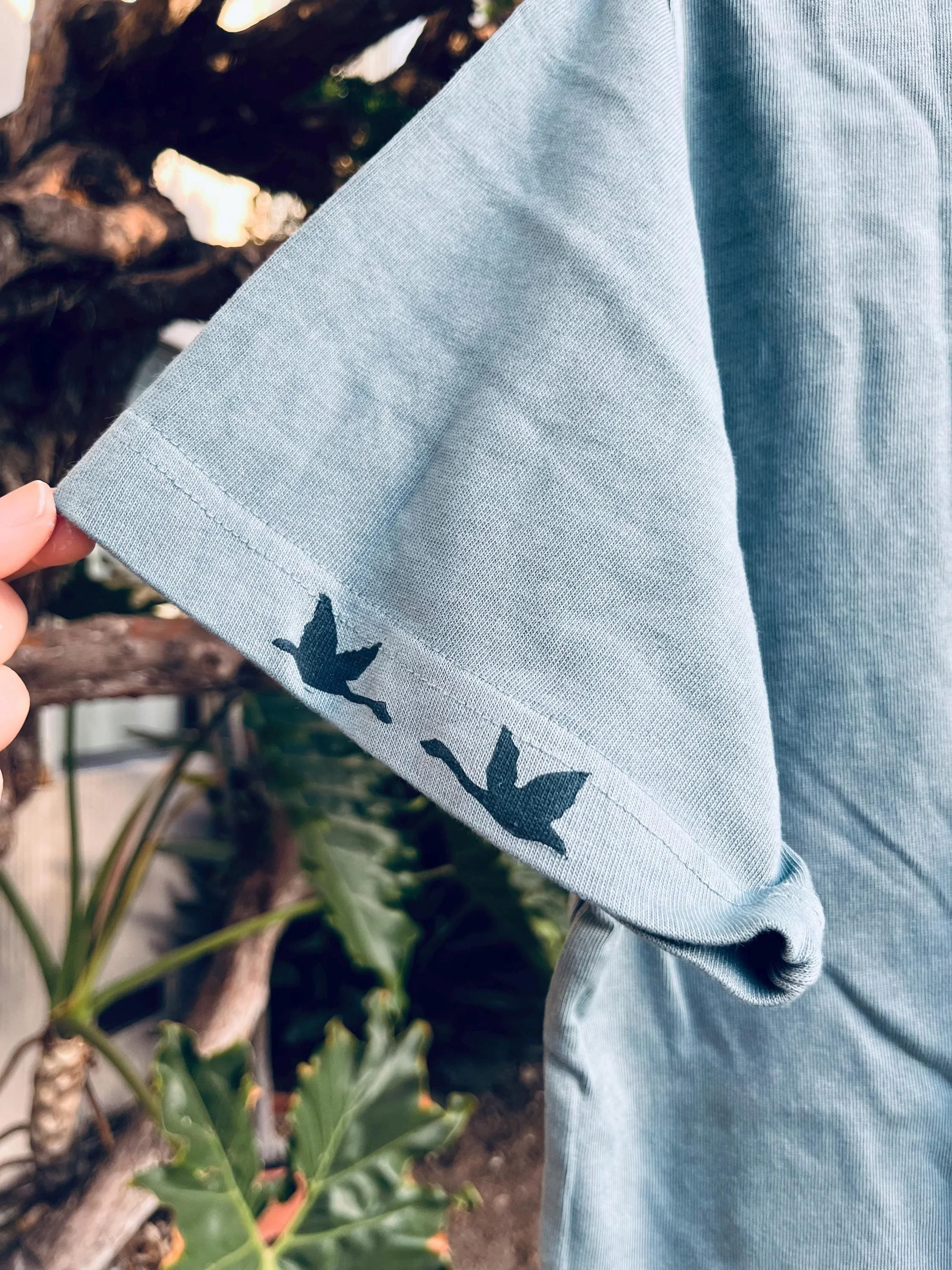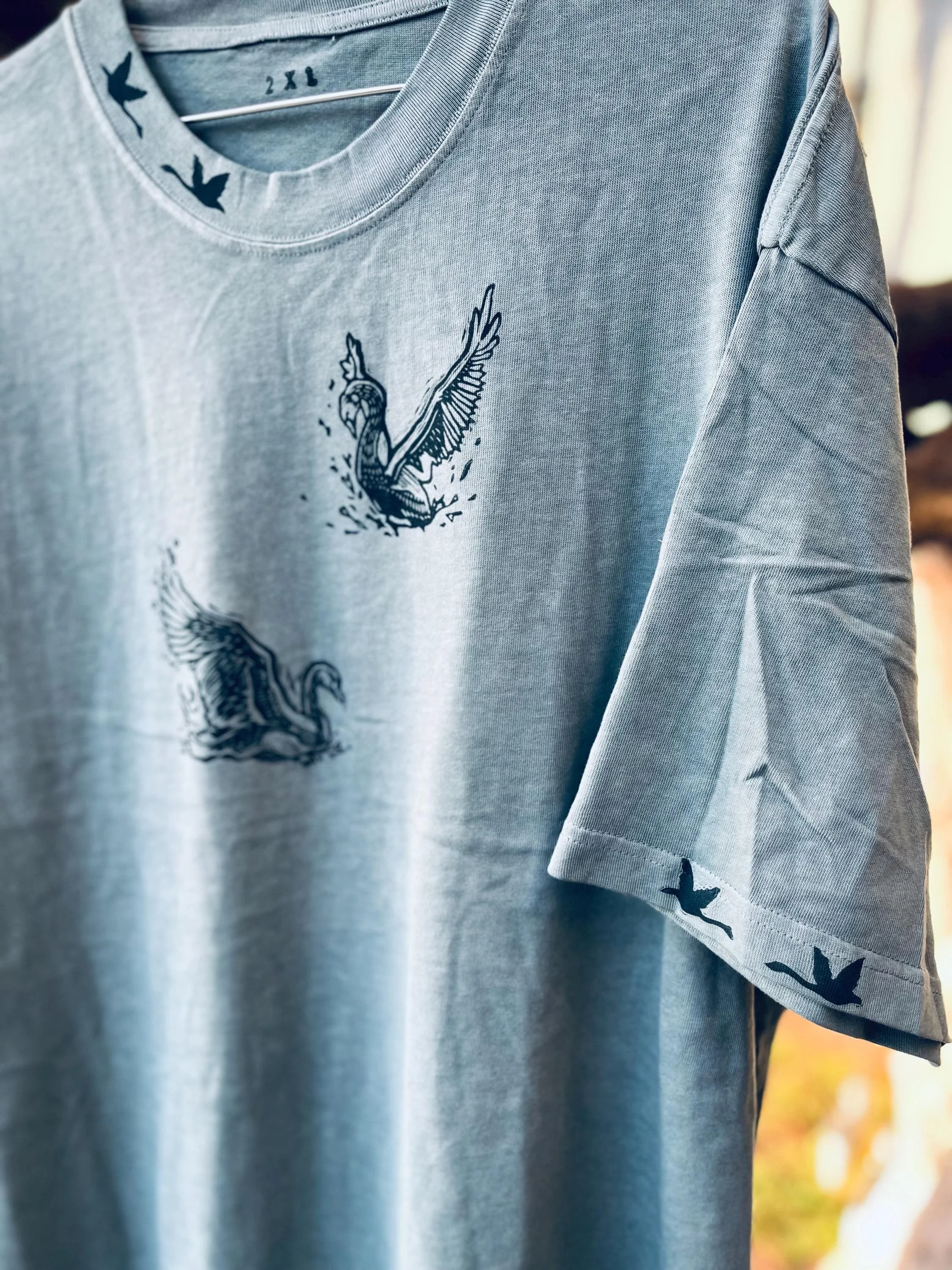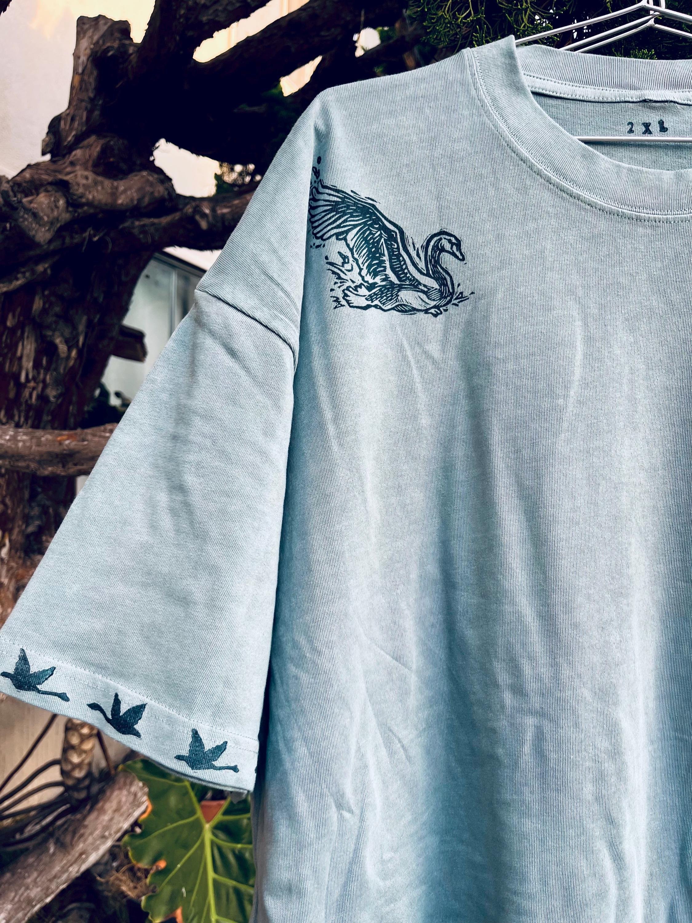 This is a surprise last minute addition to my Winter 2025 tee collection and features blue swans! I wanted to make something that was lightly winter inspired but could also be worn year-round, making it a great gift and a genuinely useful and practical item all the time not just seasonally:) I love swans- I think they’re so elegant and classic and they work beautifully with this cool vintage blue tee color.