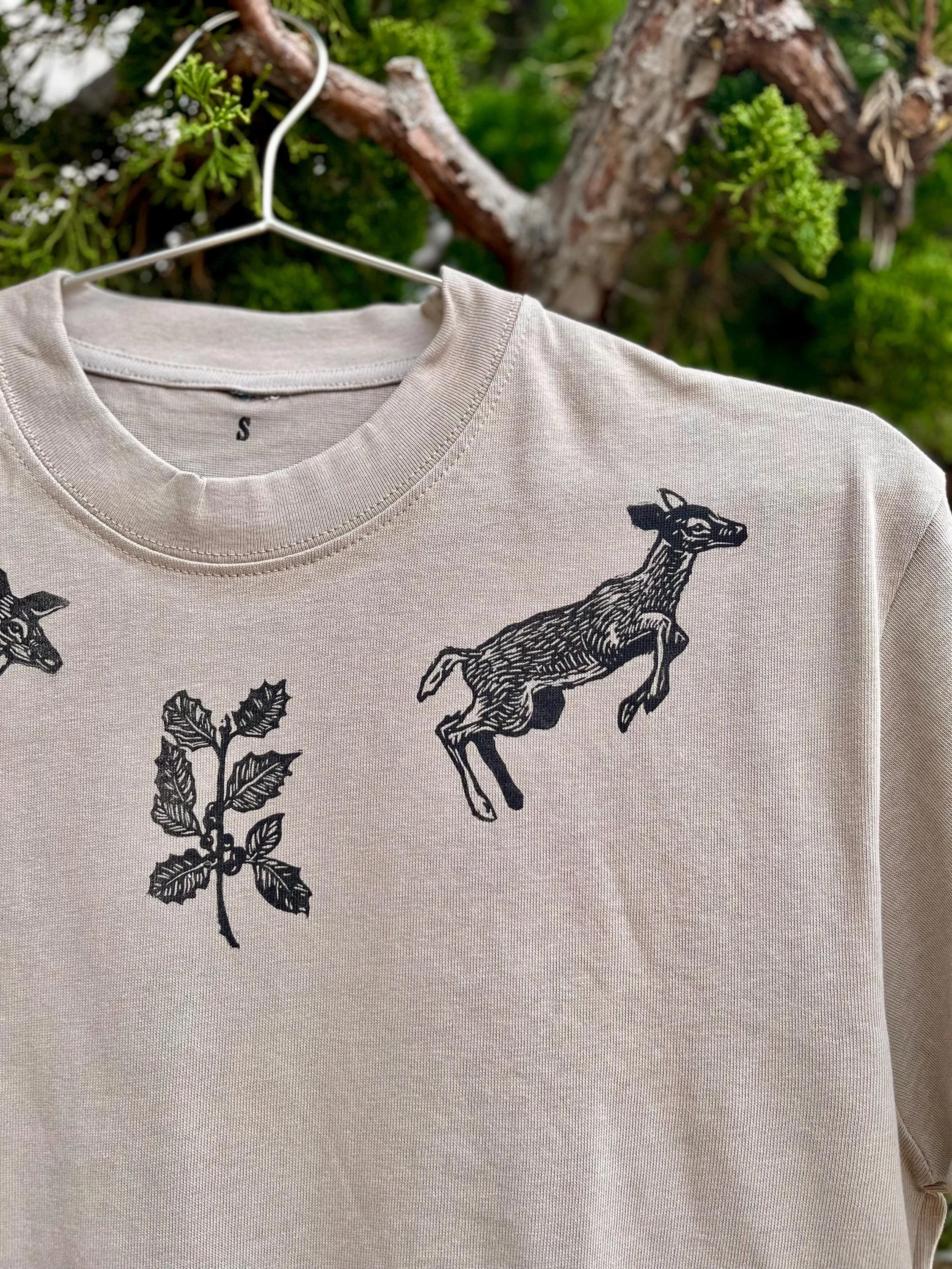 This shirt features two deer on the shoulders and a sprig of holly on the chest. There are also small holly silhouettes on each sleeve. Choose all black or red holly accents:)
