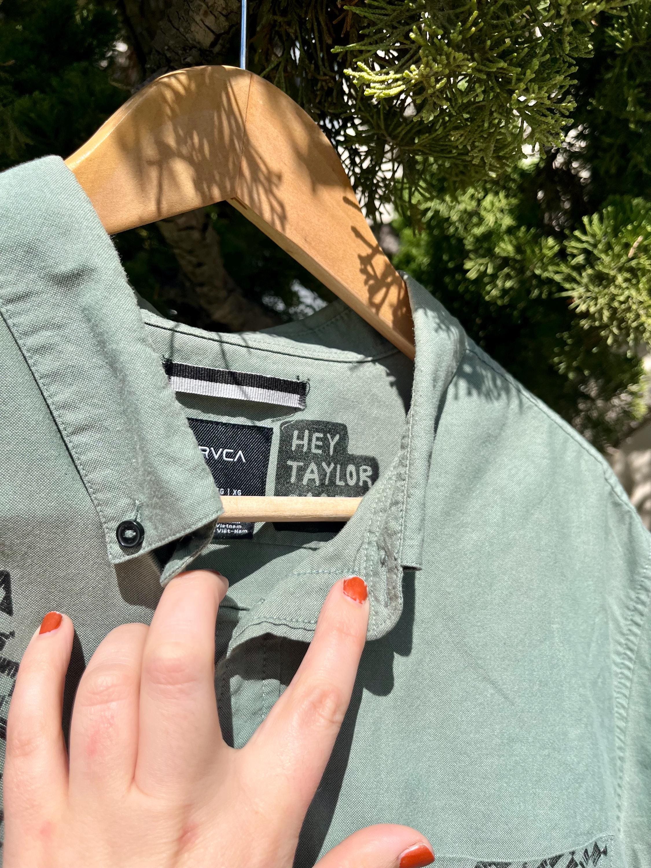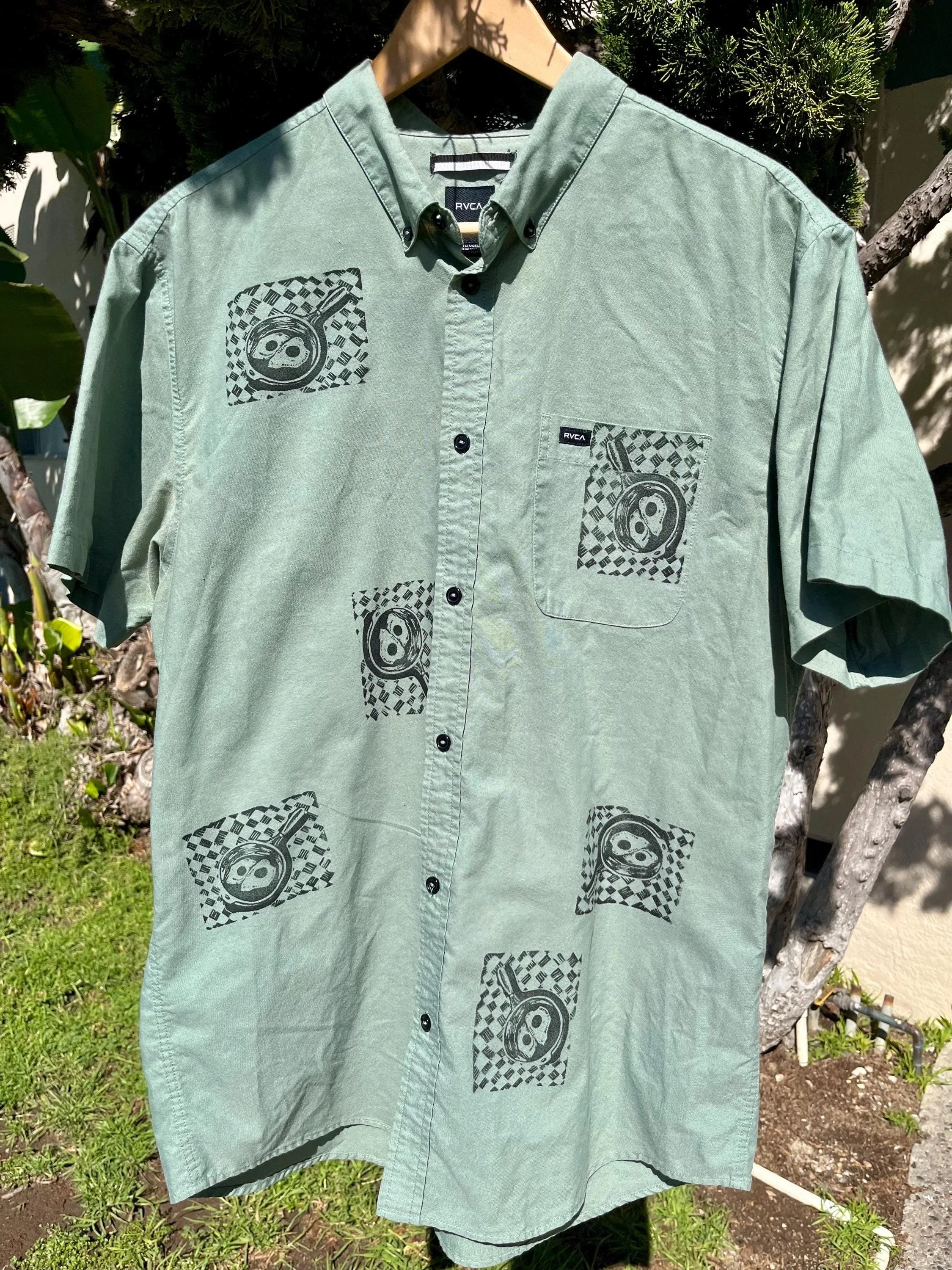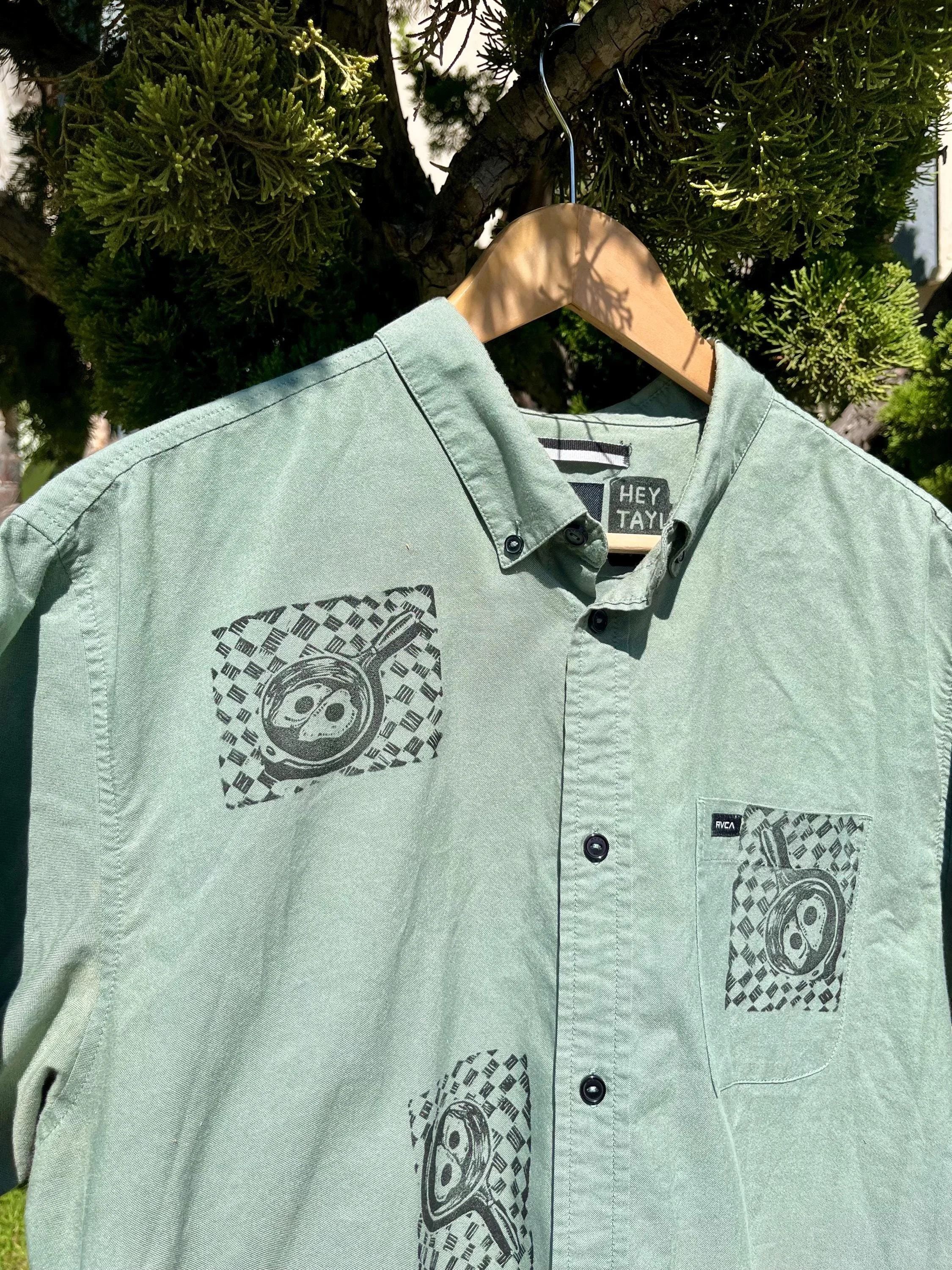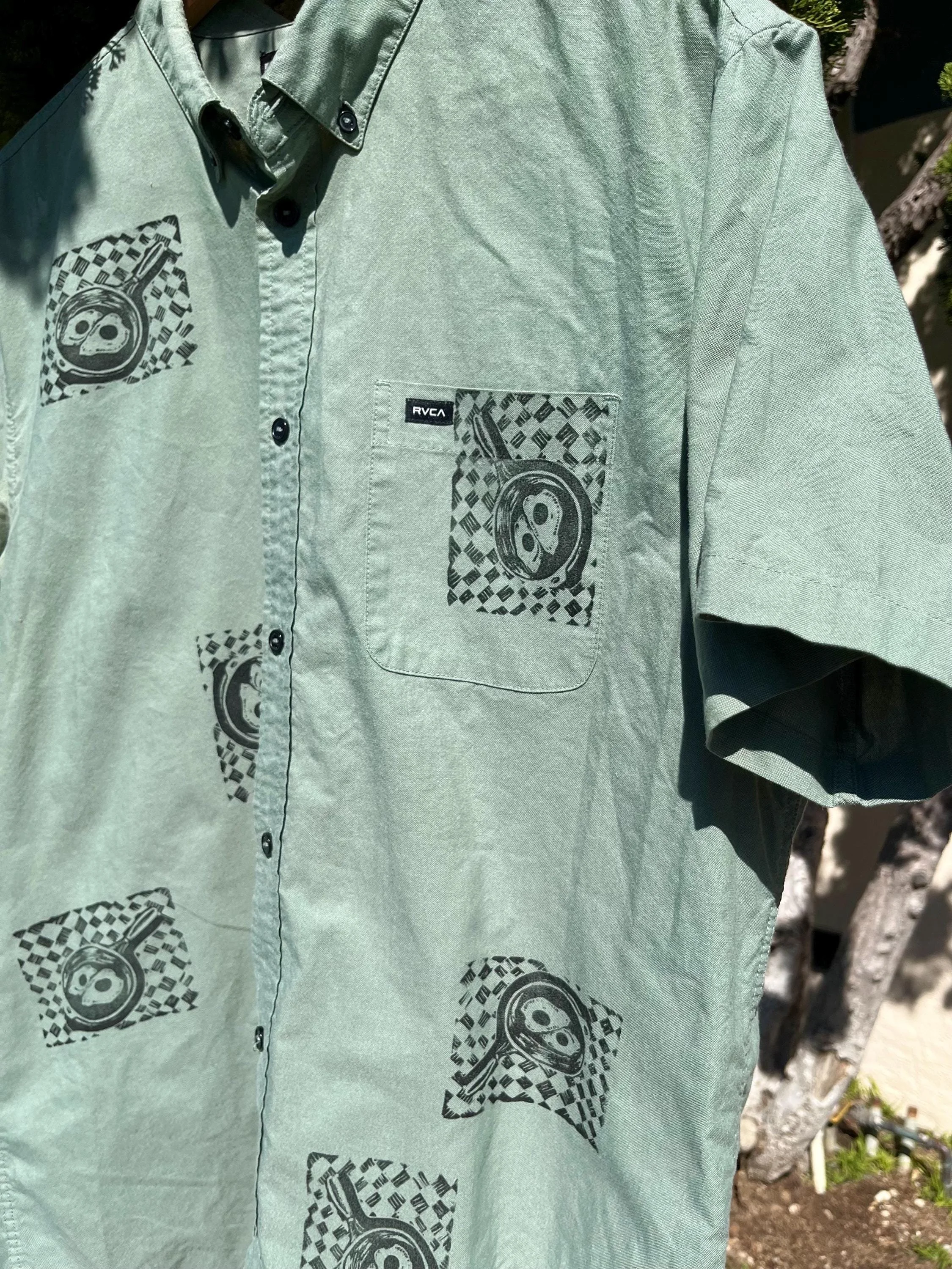 This shirt is in great condition and looks like new- I sourced this from my local thrift and printed my signature cast iron egg design on it in machine washable ink. RVCA shirts tend to hold up really well over time, so this one’s a keeper for sure!
