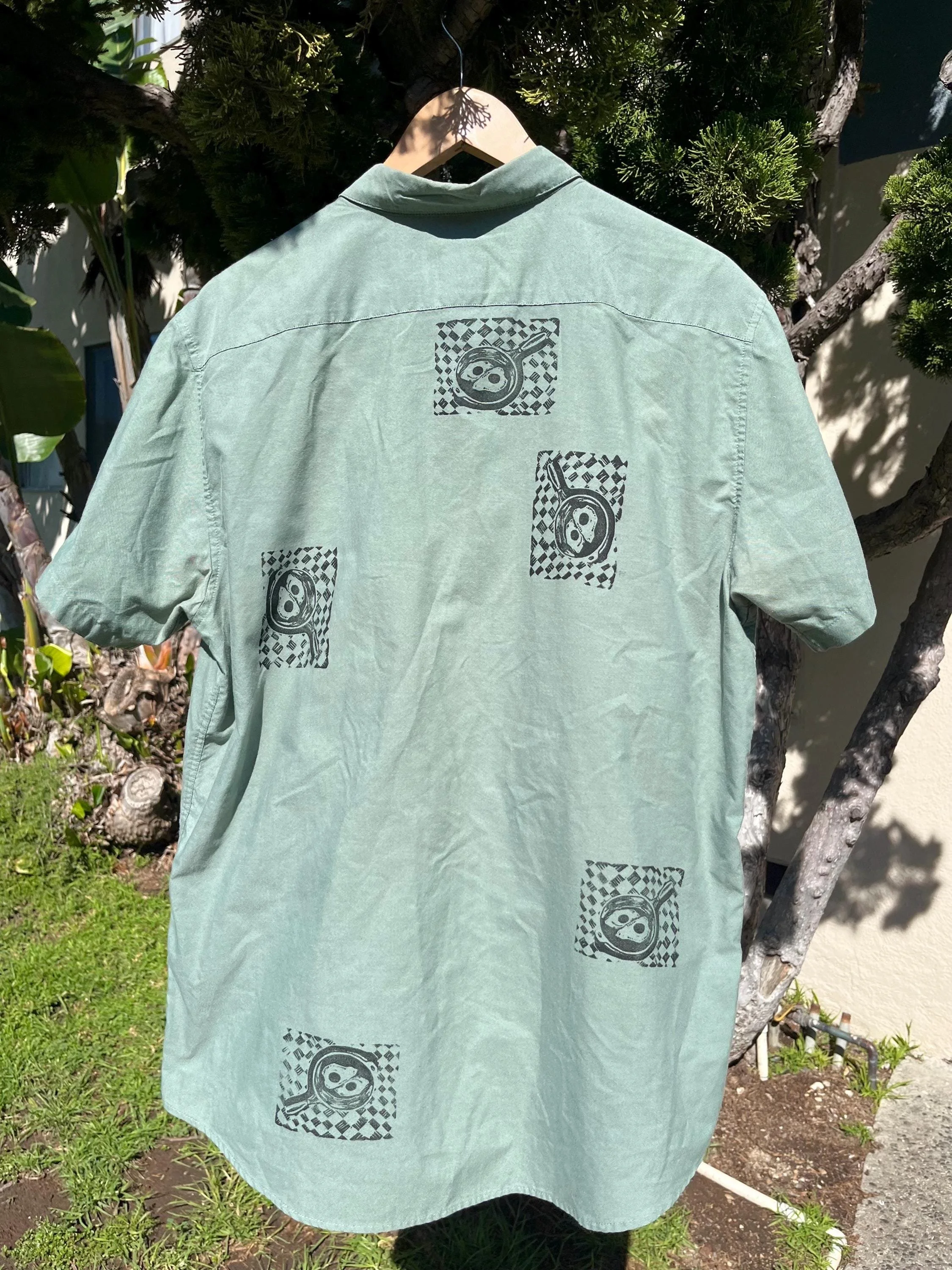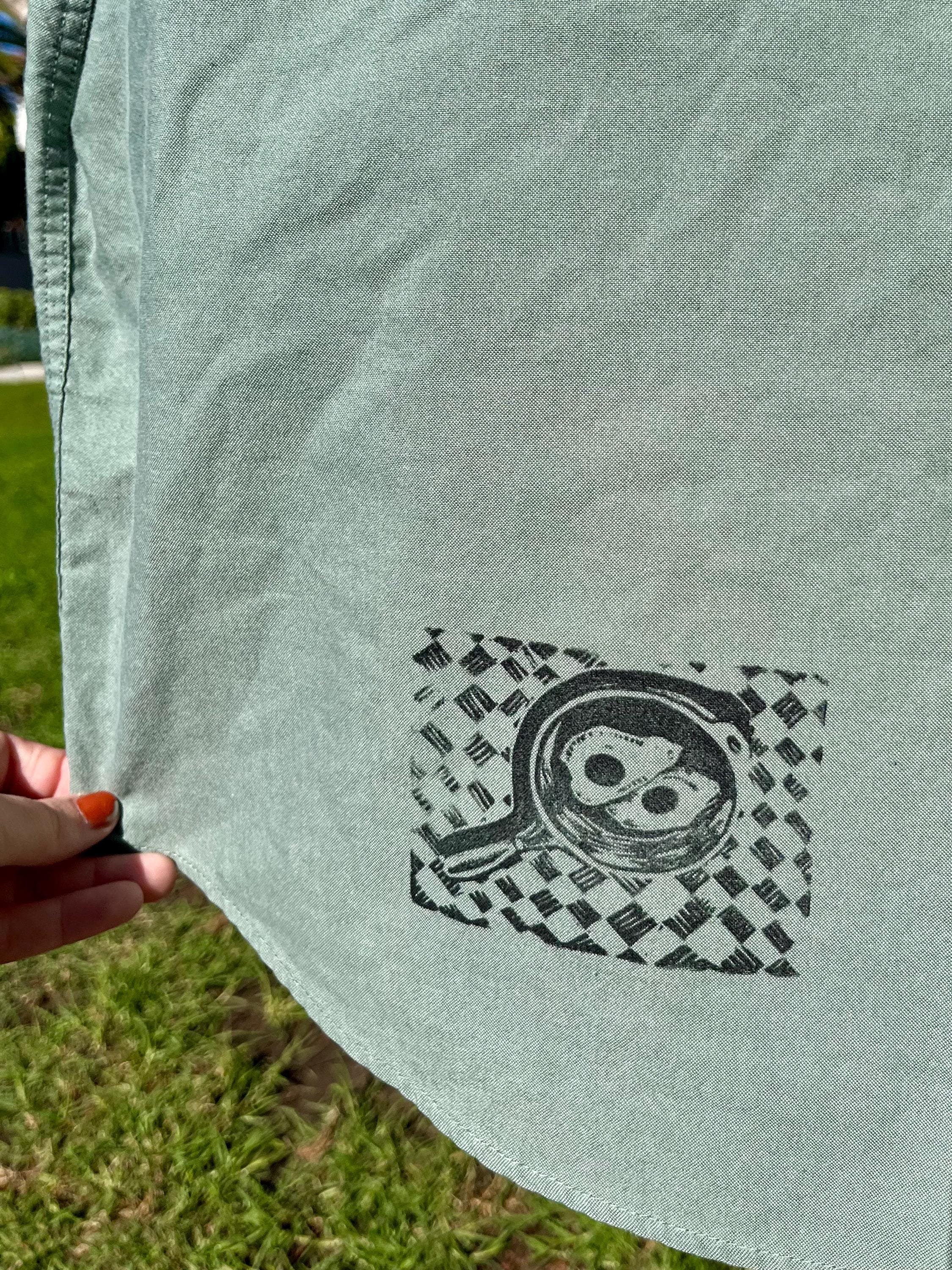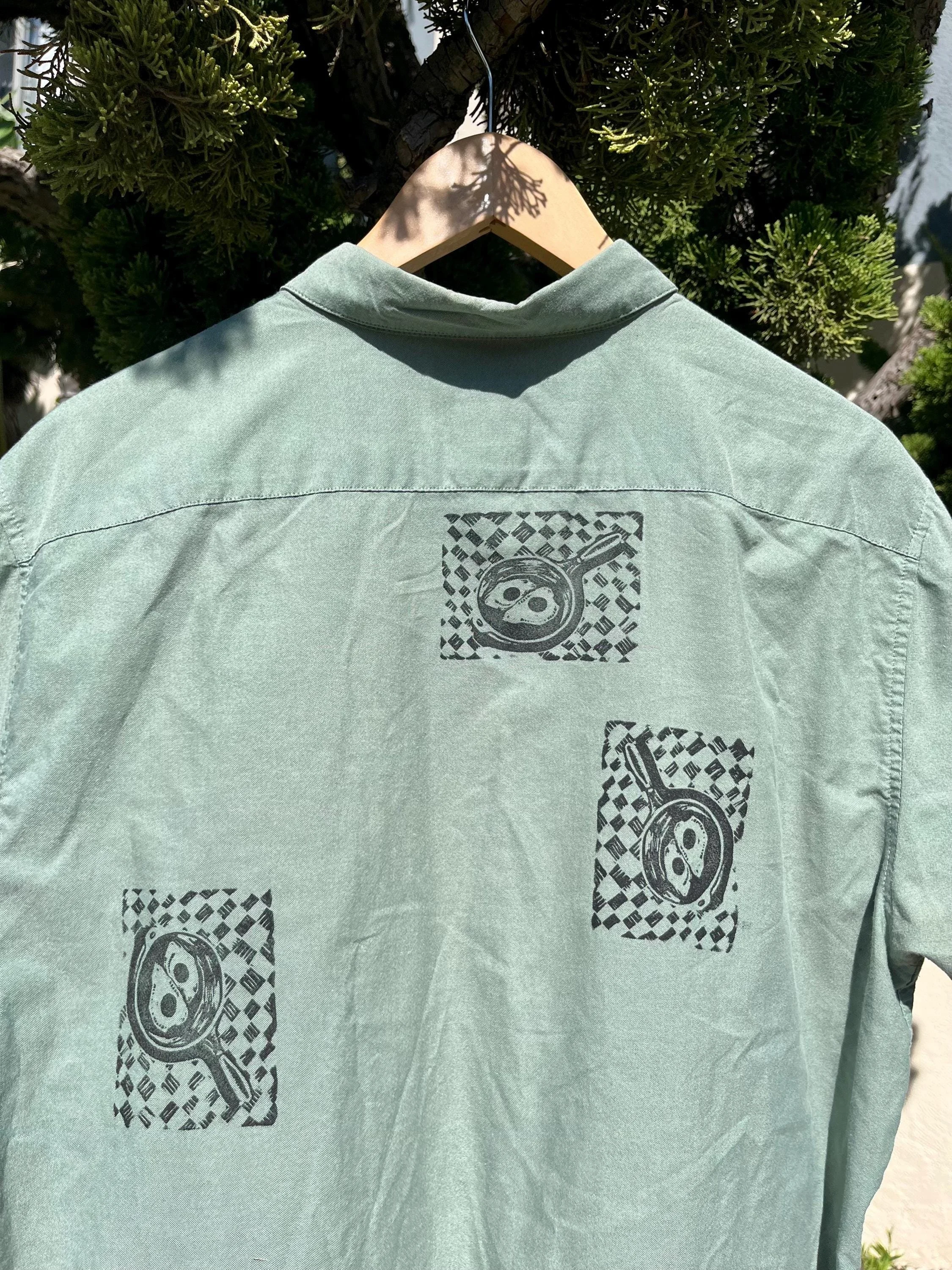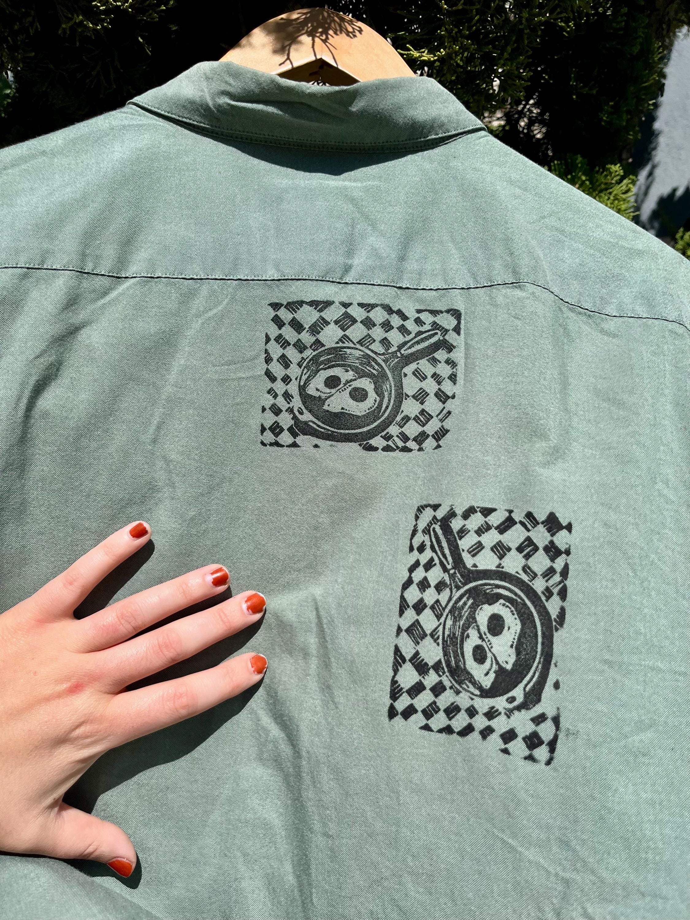 Lightweight Denim Short Sleeve Button Down - Hand Block Printed (linocut) with EGG design